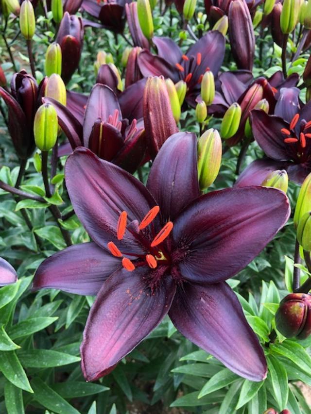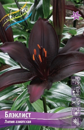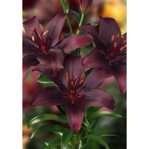очень темно-бордовый, почти черный, оранжевые тычинки, H-120см