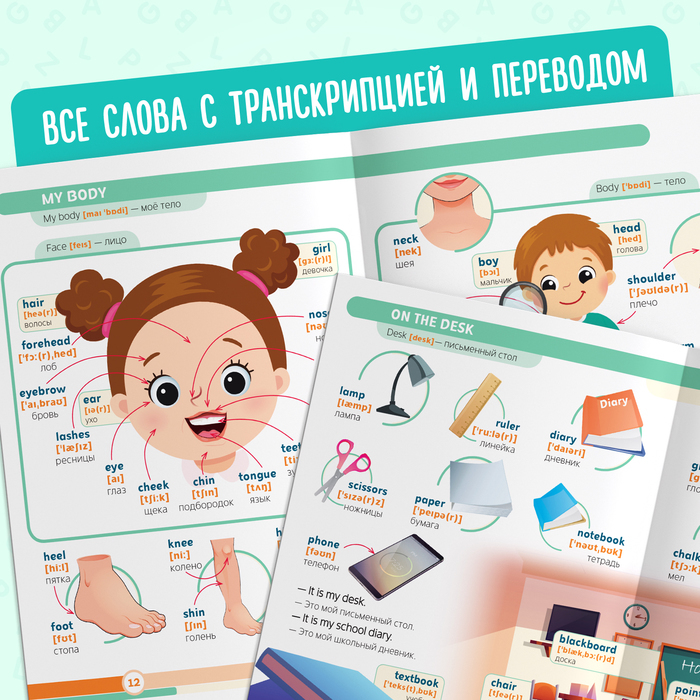 Эта активити-книга поможет ребёнку выучить первые английские слова, а большое разнообразие развивающих заданий и красочные иллюстрации не дадут заскучать потерять интерес к занятиям на протяжении всег... Показать описаниео изучения. В книге 7 тем: 1. Numbers — числа. 2. Colours — цвета. 3. Family — семья. 4. Clothes — одежда. 5. Body parts — части тела. 6. Animals — животные. 7. Food — еда. Особенности книги * Мягкий переплёт. * 36 страниц. * Размер книги — 17 ? 24 см. * С книгой ребёнок выучит более 80 слов. * Внутри книги более 35 заданий. * Рекомендована для детей от 5 лет.