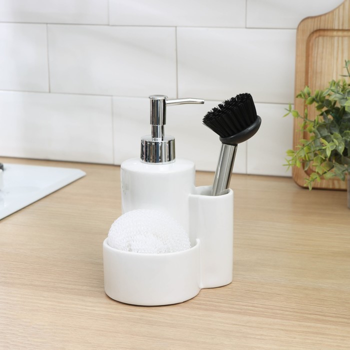 Дозатор для моющего средства Доляна «Милитари», 370 мл, с губкой и щёткой, белыйВопросы по товару
