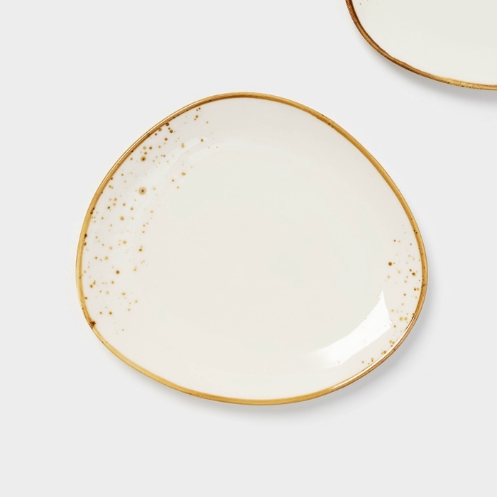 Ассиметричные блюда «Церера» от Magistro — пара белых фарфоровых тарелок с деколем в крапинку для стильной подачи закусок, десертов или гарниров. Их нестандартный силуэт и компактные размеры (18?16 см... Показать описание) подходят для составления дуэтов, мини-порций или сервировки в стиле «мезе». Поверхность выдерживает нагрев в СВЧ и чистку в посудомоечной машине, сохраняя чёткость рисунка и блеск глазури. Особенности * Набор из 2 ассиметричных сервировочных блюд. * Изготовлены из белого фарфора с деколью в крапинку. * Размер каждого — 18?16 см, высота — 1,5 см. * Подходят для использования в СВЧ-печи. * Можно мыть в посудомоечной машине. * Не имеют крышек — предназначены для открытой подачи. Сервировка без правил Эти блюда ломают симметрию, но не нарушают гармонию: их форма подчёркивает современный подход к подаче, а точечный узор добавляет лёгкое винтажное эхо. Расположите на них сырную нарезку, тосты с начинкой или фруктовую композицию — даже простые блюда обретут выразительность. Набор из двух одинаковых тарелок упрощает сервировку парных порций и поддерживает визуальный баланс на столе. Комплектация Блюдо - 2 шт