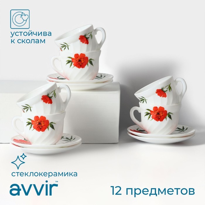 Сервиз чайный «Бархатная роза», 12 предметов: чашка 200 мл, блюдце d=14 см, стеклокерамика, цвет белый Вопросы по товару