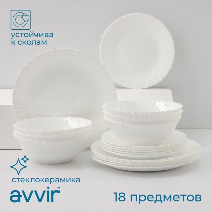 Столовый сервиз Avvir «Юкка», 18 предметов: 6 тарелок d=16.5 см, d=17.5 см, d=23 см, стеклокерамика, белый Вопросы по товару