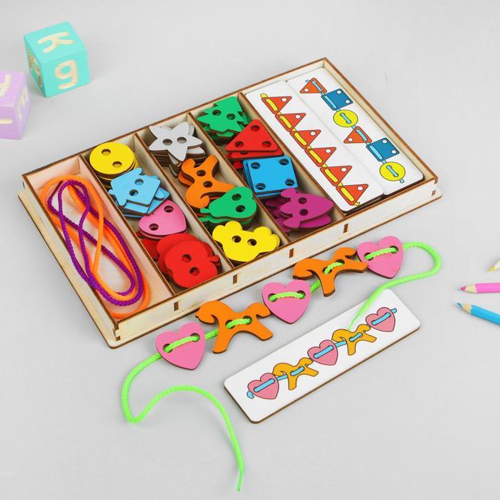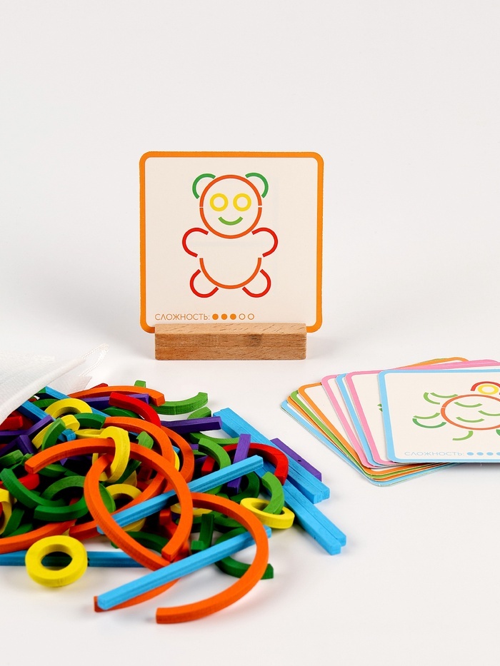 Шнуровальный набор для детей станет отличным помощником в обучающих играх. Комплект рассчитан на малышей от 3 лет и помогает развивать полезные навыки, такие как мелкая моторика, логическое мышление и... Показать описание внимание. Все элементы набора выполнены из натурального дерева, что делает игрушку безопасной и экологичной. Что входит в набор? * 72 детали разной формы и цвета. * 10 плашек для создания разнообразных задач. * 3 прочных шнурка для нанизывания. Как использовать? Ребёнок выбирает элементы из набора и нанизывает их на шнурок в заданной последовательности. Это помогает развивать способность работать по образцу и анализировать формы. Родители могут придумывать задания для изучения цветов, форм и логических цепочек, что сделает игру ещё интереснее. Преимущества * Содействует подготовке руки к письму благодаря тренировке моторики пальцев. * Развивает умение анализировать и сравнивать предметы. * Долговечные деревянные элементы безопасны и приятны на ощупь. * Идеально подходит как для индивидуальной, так и для групповой игры. Шнуровальный набор помогает ребёнку учиться через практику и весёлые задания. Игрушка станет отличным подарком для дошкольников и прекрасным дополнением к развивающим занятиям дома или в детском саду. Комплектация * 72 детали — 3.5 ? 5 см. * 10 плашек (4 ? 14.5 см. * 3 шнурка. Дополнительно Расстояние между отверстиями от 5 мм до 1.5 см.