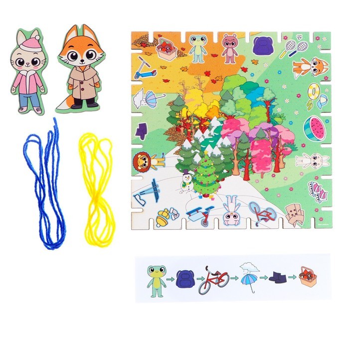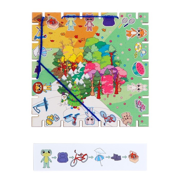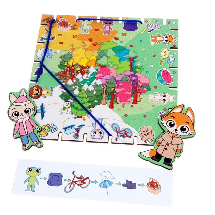 Игра «Логические цепочки. Времена года» изготовлена из дерева – экологически чистого и гипоаллергенного материала. В комплект входит: * Деревянная панель с квадратами, на которых изображены четыре вре... Показать описаниемени года. «Зима», «весна», «лето», «осень». * Квадраты в ряд (всего 4 ряда) с признаками этих времен года, таких как: погодные и природные явления, активности , одежда и обувь по сезону, фрукты или овощи по сезону. Цель игры:ребёнку необходимо правильно собрать 4 ряда признаков по всем 4 временам года. Важно!Перед тем, как предложить задание ребёнку, необходимо рассказать о временах года и о том, почему конкретно эти предметы/активности/природные явления подходят к каждому из времен. Например: зима. Зимой идет снег – складываем к зиме квадратик - снежинку. А что еще происходит зимой? Да, новый год и мандарины – складываем рядом мандарин. Можно лепить снеговика, одеваемся мы теплее – в пуховик и тёплые меховые сапоги. Весна – запускаем змея в воздух, распускаются листики, уже можно надевать лёгкие ботинки. Летом – покатаемся на велосипеде, поедим арбуз, наденем футболку с коротким рукавом, и так далее. После рассказа обо всех четырех временах года, предложите вынуть и перемешать все квадраты, а затем собрать их по временам года, самостоятельно. Чем полезны вкладыши? * Развитие логического и понятийного мышления. * С помощью такого методического материала, дети познают окружающий мир. * Развивается мелкая моторика. Вставляя определенным образом квадраты, прекрасно тренируются пальчики. * Прекрасно работает зрительная память, тренируется внимание и усидчивость. В какие ещё игры можно поиграть? 1. «Найди лишнее». Такая игра прекрасно тренирует понятийное и логическое мышление. Предложите ребенку найти лишний квадратик. Четыре квадратика у нас с изображением одежды, и одно – фрукт. В данном случае ведущий признак – это категория - одежда, так как одежды много. А фрукт один. 2. «Уборка в шкафу». Предложите ребёнку «повесить в шкаф» всю одежду, и «поставить на полку» всю обувь. Ой, а что оказалось лишнего? Яблоко – ему место в вазе на столе. И зонтик – ему место в прихожей. 3. Похожая игра, только здесь мы усложняем классификацию, добавляя еще категорию. Здесь у нас три категории: «Транспорт», «фрукты» и «одежда». Для этой игры понадобятся три комплекта логических цепочек: «Времена года, «цвета», «стихии». Эта игра так же прекрасно развивает логическое и понятийное мышление. Игра предназначена для детей от 3 лет.