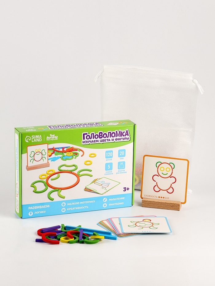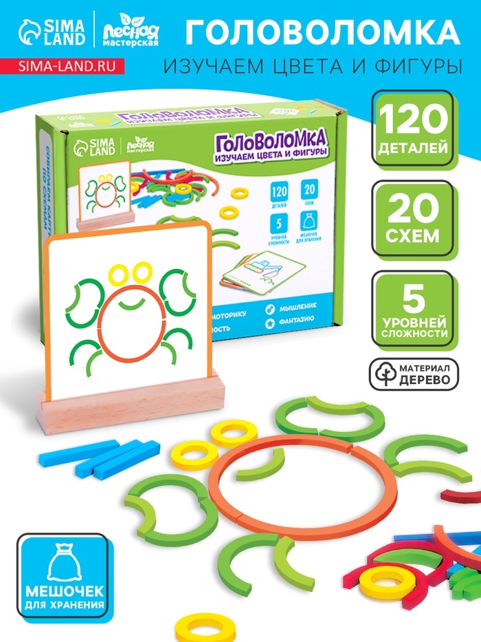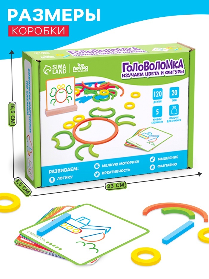 Головоломка «Изучаем цвета и фигуры» — это увлекательная развивающая игра для детей от 3 лет. Она помогает малышам познавать мир через игру, развивая логику, внимание и творческое мышление. В набор вх... Показать описаниеодит 120 деталей разного размера, 20 схем сборки и 5 уровней сложности, что делает игру интересной как для начинающих, так и для более опытных маленьких исследователей. Особенности * Материал: дерево и бумага — экологично и безопасно для детей. * 120 деталей разного размера для создания фигур по схемам или своим задумкам. * 20 готовых схем сборки и весёлых заданий для развития логики. * 5 уровней сложности — от простого к сложному, чтобы ребёнок мог прогрессировать. * Возможность создавать свои фигуры и сюжеты, развивая воображение. Преимущества Игра не только развлекает, но и помогает ребёнку учиться. Собирая фигуры по схемам, малыш тренирует внимание и логику, а создавая свои конструкции — развивает творческое мышление. Разные уровни сложности позволяют подстраивать игру под возраст и навыки ребёнка, делая её интересной на долгое время. Головоломка — это не просто игра, а инструмент для развития. Она помогает улучшить мелкую моторику, научиться концентрироваться и находить решения. А возможность придумывать свои фигуры и сюжеты делает процесс ещё более увлекательным и полезным для воображения. Дополнительно Размер коробки — 23 ? 3.5 ? 16.5 см.