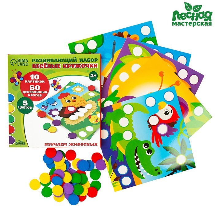 Развивающий набор "Весёлые кружочки. Изучаем животных" - 10 ярких картинок, 50 деревянных кругов, 5 основных цветов для игры и обучения! Как играть? Выбираем карточку, подбираем кружочки по цвету, доп... Показать описаниеолняя картинку Набор можно использовать многократно, придумывая новые правила игры. Кружочки можно использовать как счётный материал. С "Весёлыми кружочками" развиваем моторику, воображение и усидчивость!