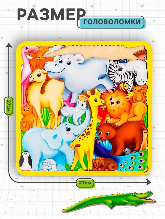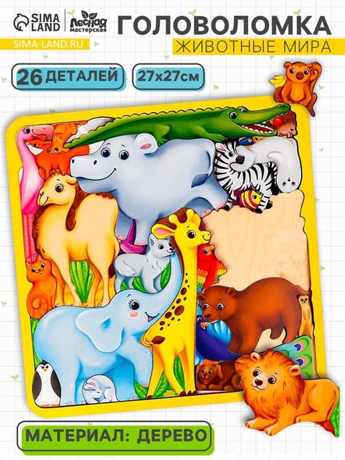 Головоломка "Животные мира" создана для самых умных малышей! Перед началом игры предложите ребёнку назвать всех животных, их отличительные черты. Затем поместите фигурки на соответствующие места. Чтоб... Показать описаниеы малышу было интереснее, придумайте захватывающую историю (как зовут каждого зверька, как они оказались все вместе ит.д.). Фигурками также можно играть отдельно. Во время игры ребёнок знакомится с формами и цветами, развивает мелкую моторику, внимательность и усидчивость, изучает соотношение "больше-меньше".