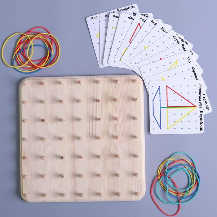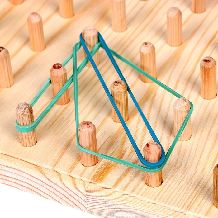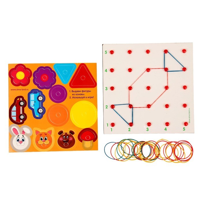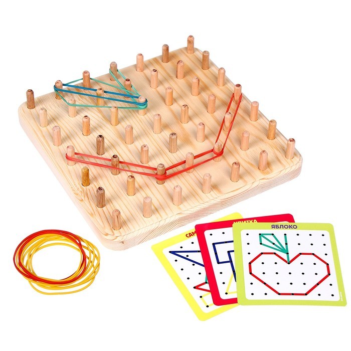 Геоборд — это специальная доска для конструирования различных изображений с помощью равноудалённых друг от друга штырьков и резиночек. Их малышу предстоит нанизывать на выпуклые элементы и создавать т... Показать описаниеаким образом разнообразные фигуры. Как работать с геобордом * По схемам. Предложите ребёнку повторить готовый рисунок. В наборе уже есть карточки с заданиями. * По заданию. В этом случае попросите изобразить букву, цифру, фигуру или даже лабиринт для персонажа. * Диктант. Называйте направление «право-лево», «верх-низ» и количество делений, а малышу предстоит повторить инструкцию на геоборде. * Рисование. Эта нехитрая игрушка может быть просто полем для фантазии, где ребёнок будет придумывать и воплощать любые свои задумки.