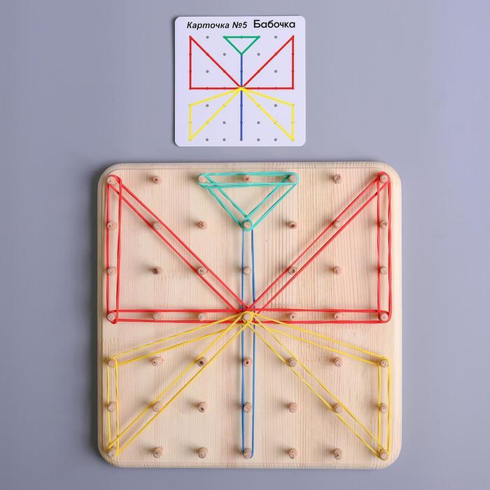 Геоборд — это деревянная доска со штырьками, на которые нужно нанизывать разноцветные резинки. Делайте это в соответствии с заданиями, указанными на карточках или сами придумывайте изображения. Особен... Показать описаниености * В наборе 12 двусторонних ламинированных карточек с заданиями. * Игра развивает мышление, внимание, память, мелкую моторику и фантазию. * Геоборд сделан из экологически чистого материала — массива дерева. * Игрушка тщательно отшлифованная, поэтому она не имеет острых краёв. Варианты игры 1. Покажите ребёнку, как из прямых линий построить простую фигуру, а из простых фигур — предметы. Попросите ребёнка повторить за вами. 2. Предложите ребёнку выбрать одну из карточек и попросите повторить рисунок на геоборде с помощью резинок. 3. Покажите ребёнку точку старта на геоборде и предложите двигаться в определенном направлении, надевая резинки на штырьки. 4. Изобразите на геоборде половину рисунка и предложите ребёнку нарисовать с помощью резинок зеркальное отражение. Дополнительно * Размер карточек: 10 ? 10 см. * Размер геоборда: 23 ? 23 см. * Диаметр штырька — 8 мм. * Высота штырька от планшета — 2 см.