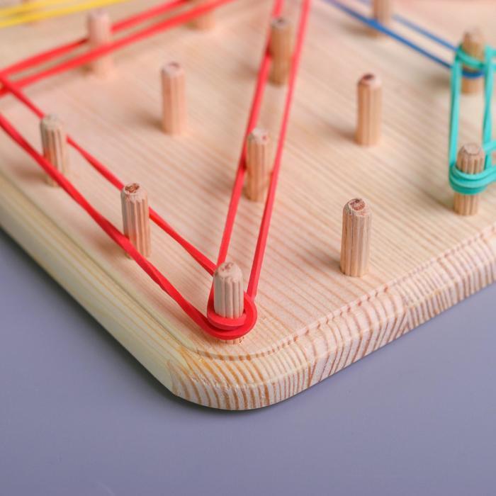 Геоборд — это специальная доска для конструирования различных изображений с помощью равноудалённых друг от друга штырьков и ниток. Малышу предстоит нанизывать нитку на штырьки, следуя последовательнос... Показать описаниети из задания. Подобные игры очень полезны для ребёнка: кроху можно обучать алфавиту, счёту, разучивать с ним геометрические фигуры. Во время работы с геобордом малыш развивает мелкую моторику, логическое и абстрактное мышление, а также воображение. Играть и учиться с таким пособием можно различными способами: 1. По схемам. Предложите ребёнку повторить готовый рисунок. В наборе уже есть 6 задач для занятий. 2. По заданию. В этом случае попросите чадо изобразить букву, цифру, фигуру или даже лабиринт для персонажа. 3. Диктант. Называйте направление «право-лево», «верх-низ» и количество делений, а крохе предстоит повторить инструкцию на геоборде. 4. Рисование. Эта нехитрая игрушка может быть просто полем для фантазии вашего малыша, где он будет придумывать и воплощать любые свои задумки.