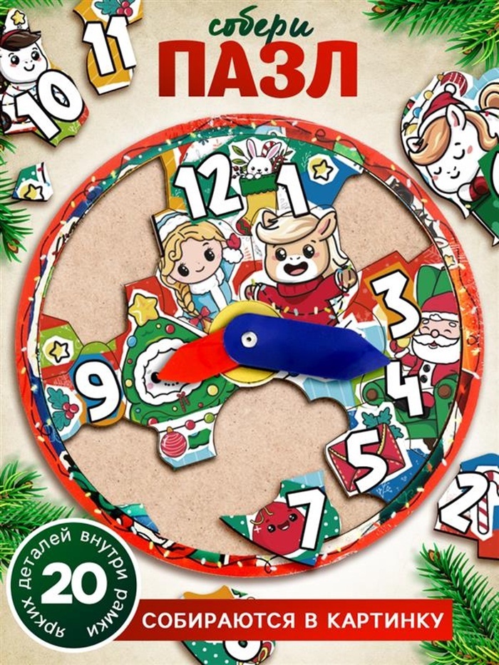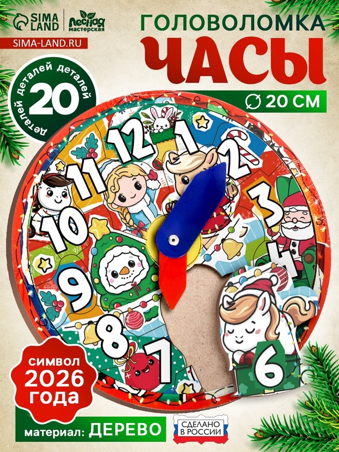 Деревянная головоломка «Часы с лошадкой» — это увлекательный и обучающий аксессуар для детей от 3 лет, который поможет освоить понятие времени и развить важные навыки. Стильный дизайн с символом года ... Показать описание2026 — лошадью — делает её не только полезной, но и привлекательной для малышей. Преимущества головоломки * Изготовлена из дерева: экологичная, безопасная и долговечная. * Универсальный дизайн: яркие элементы и символ года привлекают внимание и делают обучение интересным. * Компактный размер: удобно хранить и использовать дома или в детском саду. * Подвижные стрелки на рамке позволяют практиковаться в определении времени. * 20 деталей внутри рамки создают пазл, который стимулирует логическое мышление и моторику. Как играть? 1. «Изучи время». Используйте подвижные стрелки и цифры, чтобы объяснить ребёнку, как определять время по механическим часам. Это помогает закрепить базовые знания о времени суток. 2. «Собери пазл». Предложите малышу собрать все 20 элементов внутри рамки, чтобы получилась целостная картинка. Это развивает внимательность и координацию движений. 3. «Придумай историю». Попросите ребёнка рассказать историю про лошадку, которая украшает головоломку. Это стимулирует воображение и речевые навыки. Навыки, которые ребёнок будет развивать * Изучение цифр и времени суток. * Мелкая моторика рук через работу с элементами головоломки. * Внимание и концентрация при выполнении задач. * Логическое мышление и самостоятельность. Идея для подарка Головоломка «Часы с лошадкой» станет отличным подарком для детей, которые любят игры и творчество. Она подходит как для домашнего использования, так и для занятий в детских садах. Подарите возможность совместить обучение и веселье, создавая яркие и запоминающиеся моменты! Дополнительно Диаметр — 20 см.