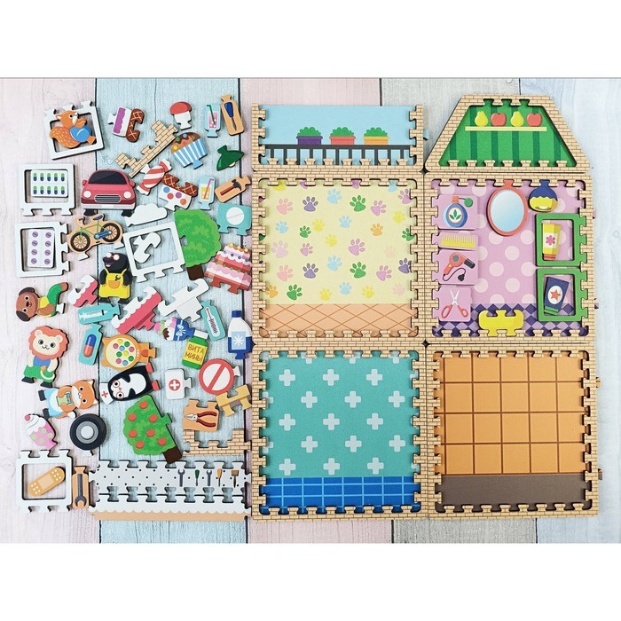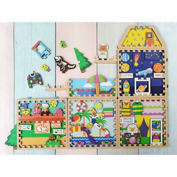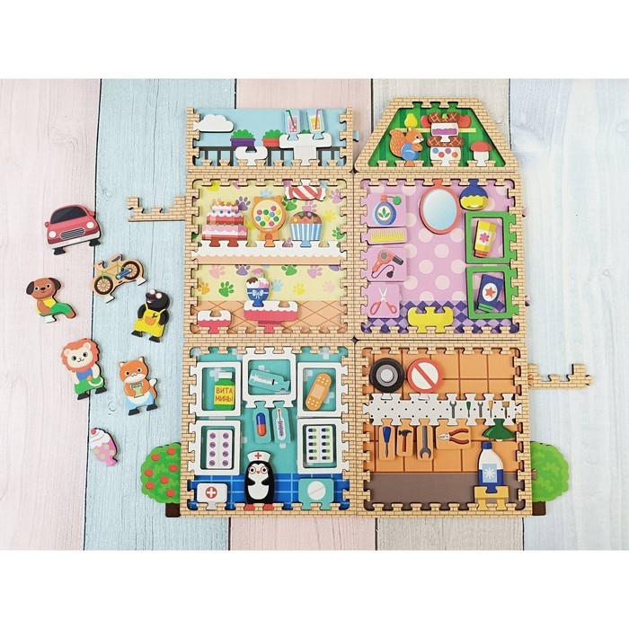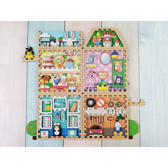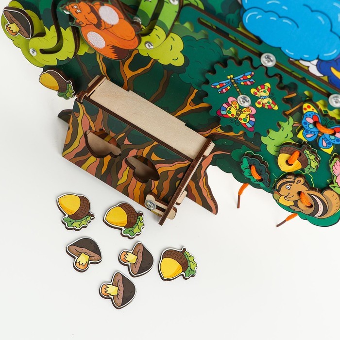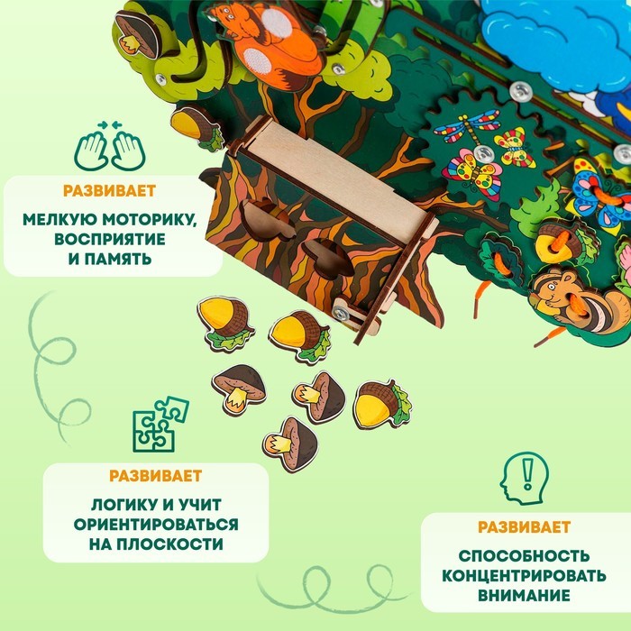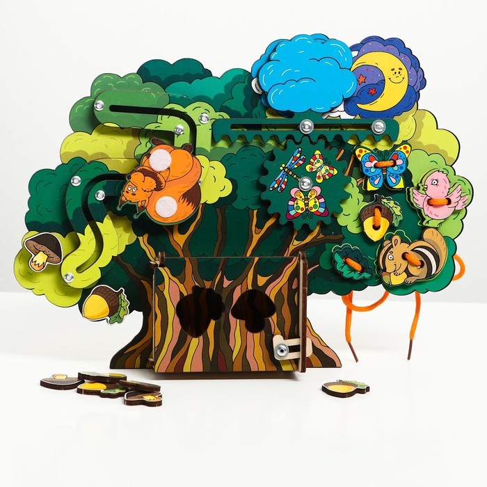 Игрушка «Бизидуб» изготовлена из экологически чистого дерева. Бизиборд даст ребёнку возможность самостоятельно и безопасно изучить интересные бытовые объекты: щеколды и замки, липучки, шнуровку, прище... Показать описаниепки и др. Чем полезен бизиборд 1. Развивает глазомер, зрительно-моторную координацию. 2. Ребёнок учится ориентироваться на плоскости. Различать предметы по силуэтам. 3. Развивает логическое мышление, зрительную память, внимание и усидчивость. 4. Формирует познавательную активность. 5. Развивает мелкую моторику. Комплектующие: * шнуровка, * липучки, * передвижные фигурки, * тактильная поверхность, * фигурки-вкладыши. Как играть Предложите ребёнку «прогуляться в лесу». Покажите как работать со шнуровкой, разложите специальные фигурки по контурам. Игрушка рекомендована для детей от 3 лет.