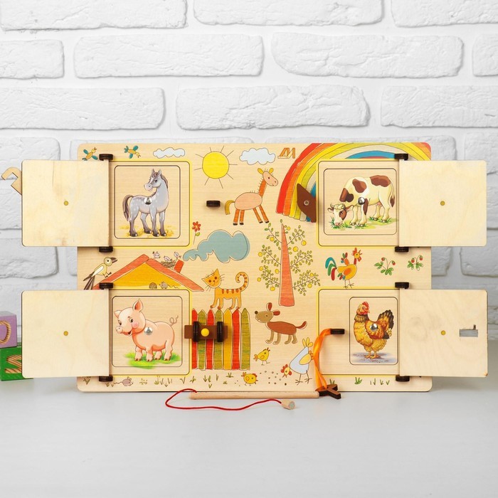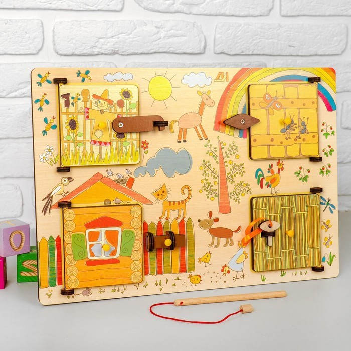 Бизиборд - игрушка, которая опробована педагогами, разработчиками методик обучения, а также непосредственно родителями малышей. В процессе игры с бизибордом ребёнок будет познавать мир, ознакомится с ... Показать описаниепредметами быта, а также получит навыки самообслуживания (завязывание шнурков, застёгивание молнии и мн.др). Несомненные плюсы бизиборда: * изучение различных свойств предметов * формирование навыков открывания и закрывания различных замков * развитие мелкой моторики и самостоятельности 7 активностей: * выключатель * колокольчик * щеколда * липучка * рамка-вкладыш * колесо * шнуровка
