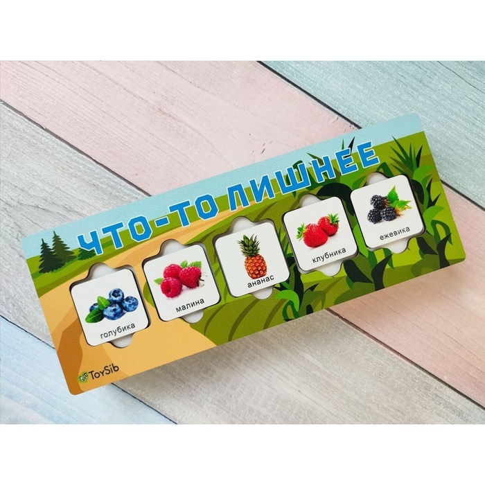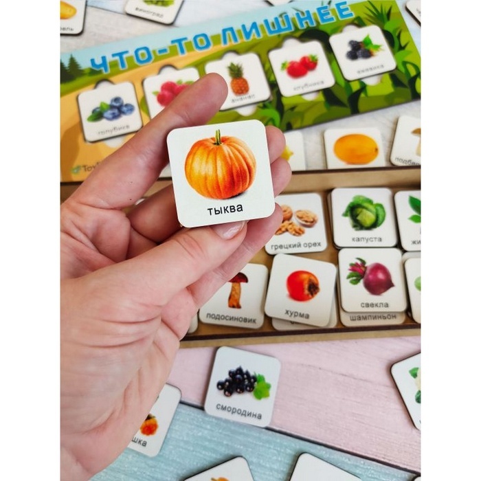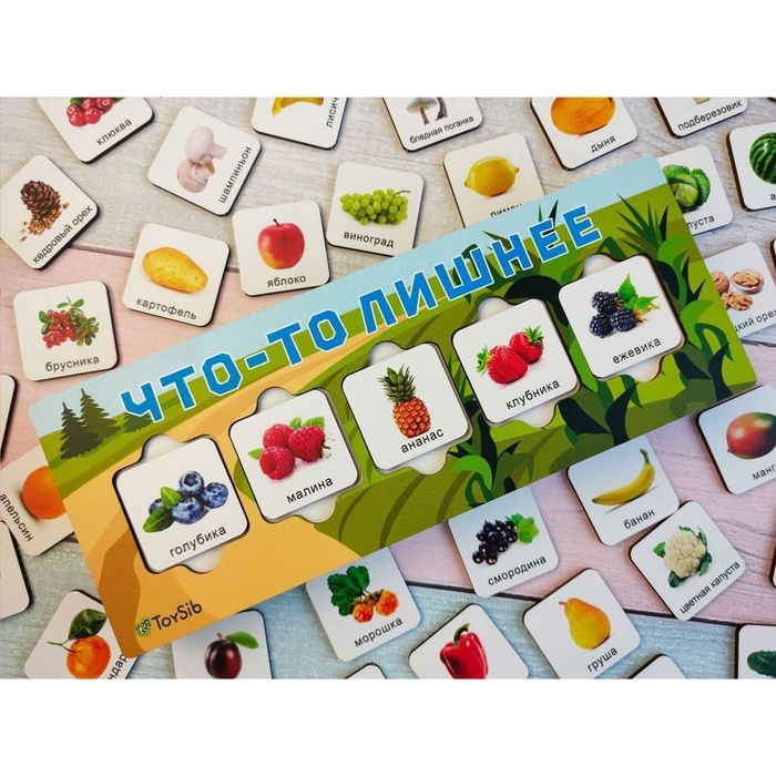 Увлекательная игра головоломка - логика «Что-то лишнее» — познакомит ребёнка с овощами, фруктами, орехами, ягодами и грибами; научит сопоставлять, сравнивать, сортировать по разным признакам: типу, цв... Показать описаниеету, форме, вкусу и т.д. Что развивает * Игра развивает мелкую моторику, внимание, логическое мышление, воображение, коммуникативные навыки, умение сопоставлять и сравнивать, расширяет кругозор, учит самостоятельно рассуждать. Игры 1. Игра «Знакомство». Рассмотрите с ребенком фишки. Попросите ребёнка рассказать все то, что ему известно про плод, изображенный на той или иной фишке. Если ребёнок затрудняется, помогите ему вопросами: как называется? где растет? дикий или культурный? какого цвета? какой формы? какого размера? и т.д. Расскажите малышу всё, что вы знаете про неизвестные ему плоды. 2. Игра «Лишняя фишка». Вложите в игровое поле 4 фишки с плодами, которые объединяет один общий признак, и 1 фишку с плодом, отличным по данному признаку. Примеры: 4 овоща +1 ягода; 4 красных + 1 зеленый; 4 с косточкой + 1 без косточки; 4 съедобных + 1 несъедобный; 4 диких + 1 культурный. Задача ребёнка, полагаясь на логику, найти лишнюю фишку и объяснить свой выбор. 3. Игра «Сортировка по общему признаку». Попросите малыша распределить фишки по общему признаку. Примеры: овощи/фрукты/ягоды/грибы/орехи; растет на дереве/в земле/на земле; внутри косточка/нет косточки; съедобный/несъедобный; дикий/культурный; сочный/сухой; по цветам; по форме; по вкусу и т.д. 4. Игра «Нас объединяет». Вложите в игровое поле фишки с плодами, которые объединяет один общий признак. Признак вслух не озвучивается. Примеры: употребляются в чищенном виде; не пригодны к пище в сыром виде; растут на ветке; содержат семена; название начинается/заканчивается на одинаковую букву и т.д. Задача ребёнка, полагаясь на логику, найти между плодами общий признак и объяснить свой выбор. 5. Игра «Будь внимателен». Разложите в ряд несколько фишек. Попросите малыша запомнить их и закрыть глаза. Уберите одну фишку. Какой фишки не хватает? Поменяйте 2 фишки местами. Что изменилось? Начинайте игру с небольшим количеством фишек (4-5 шт). Постепенно увеличивайте сложность, добавляя в игру большее количество фишек. В процессе игры * Проговаривайте вслух названия плодов, их разновидности, цвет, вкус и т.д. * Обсуждайте сходства, различия, признаки. * По завершении игры попросите ребёнка самостоятельно собрать все фишки в сундучок. В комплекте * 70 фишек. * Удобный сундучок для хранения позволит взять игру в дорогу, в гости, на дачу и т.д. Рекомендовано для детей от 3 лет. Комплектация * сундучок с игровым полем на крышке — 1 шт. (размер — 27 ? 10,4 ? 3,6 см); * игровые фишки — 70 шт. (размер — 4 ? 4 см); * инструкция — 1 шт.