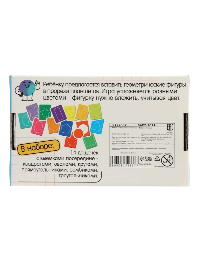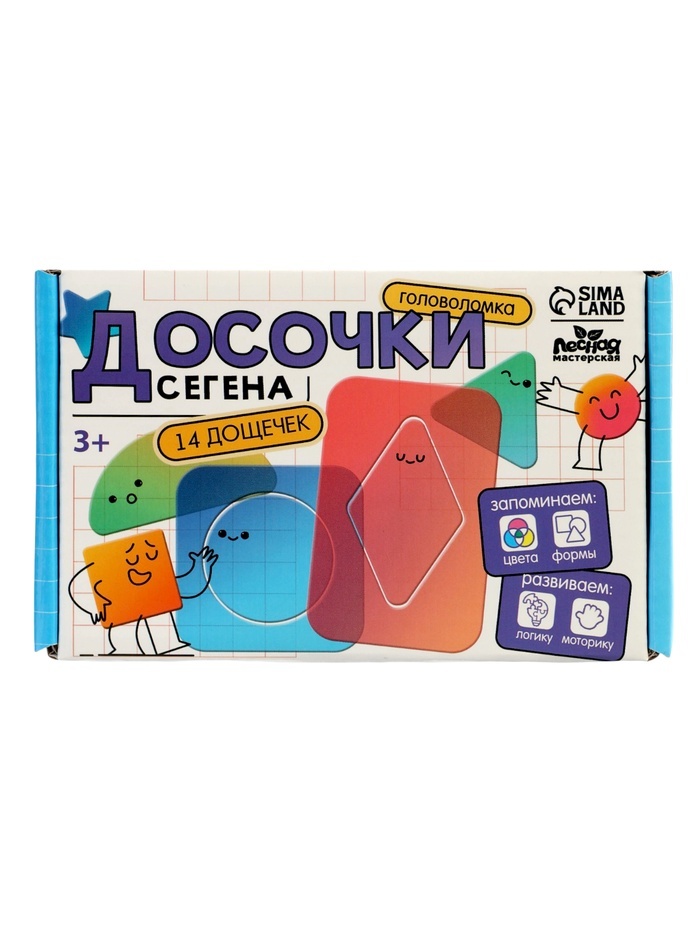 Головоломка «Досочки Сегена» — это классическая развивающая игра, созданная по методике Эдуарда Сегена. В комплект входят досочки с выемками и соответствующие им фигурные вкладыши, которые ребёнку нуж... Показать описаниено будет вставлять на свои места. Простая, но эффективная головоломка развивает мелкую моторику, логическое и пространственное мышление, а также помогает в изучении форм и цветов. Преимущества головоломки * Развивает внимание, концентрацию и логическое мышление у детей. * Помогает улучшить мелкую моторику и координацию движений. Эти навыки важны для подготовки к письму. * Изготовлена из безопасных материалов, поэтому надёжна и долговечна. * Компактный размер позволяет легко хранить игрушку и брать её с собой. * Подходит для детей от 3 лет. Её легко освоят даже самые маленькие. Отличный инструмент для обучения Головоломка отлично подходит для занятий дома и в детском саду, помогает детям не только развивать когнитивные навыки, но и получать удовольствие от игры. Игрушку можно использовать как часть обучающих программ по методике Сегена, поэтому эта головоломка подойдёт для раннего развития ребёнка.