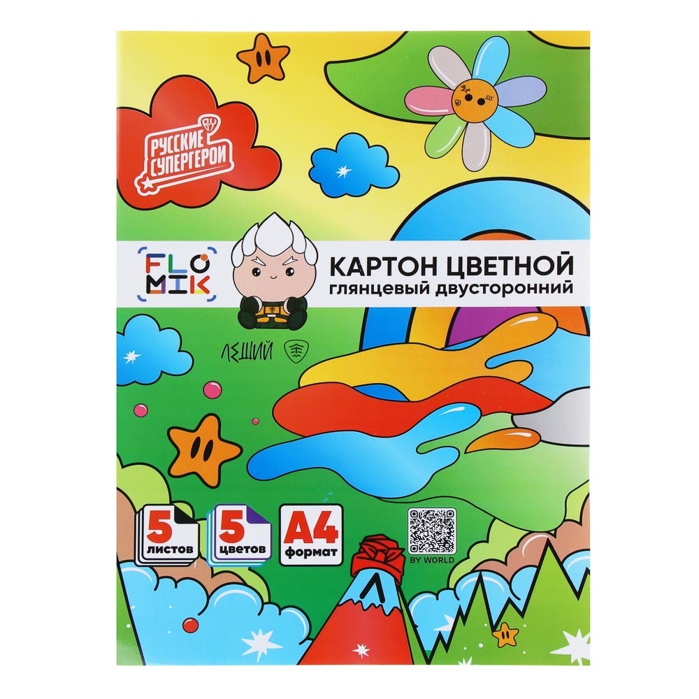 FLOMIK Картон цветной глянцевый мелованный, двухсторонний, А4, 5л., 5цв., 160 г/м2, в папке
