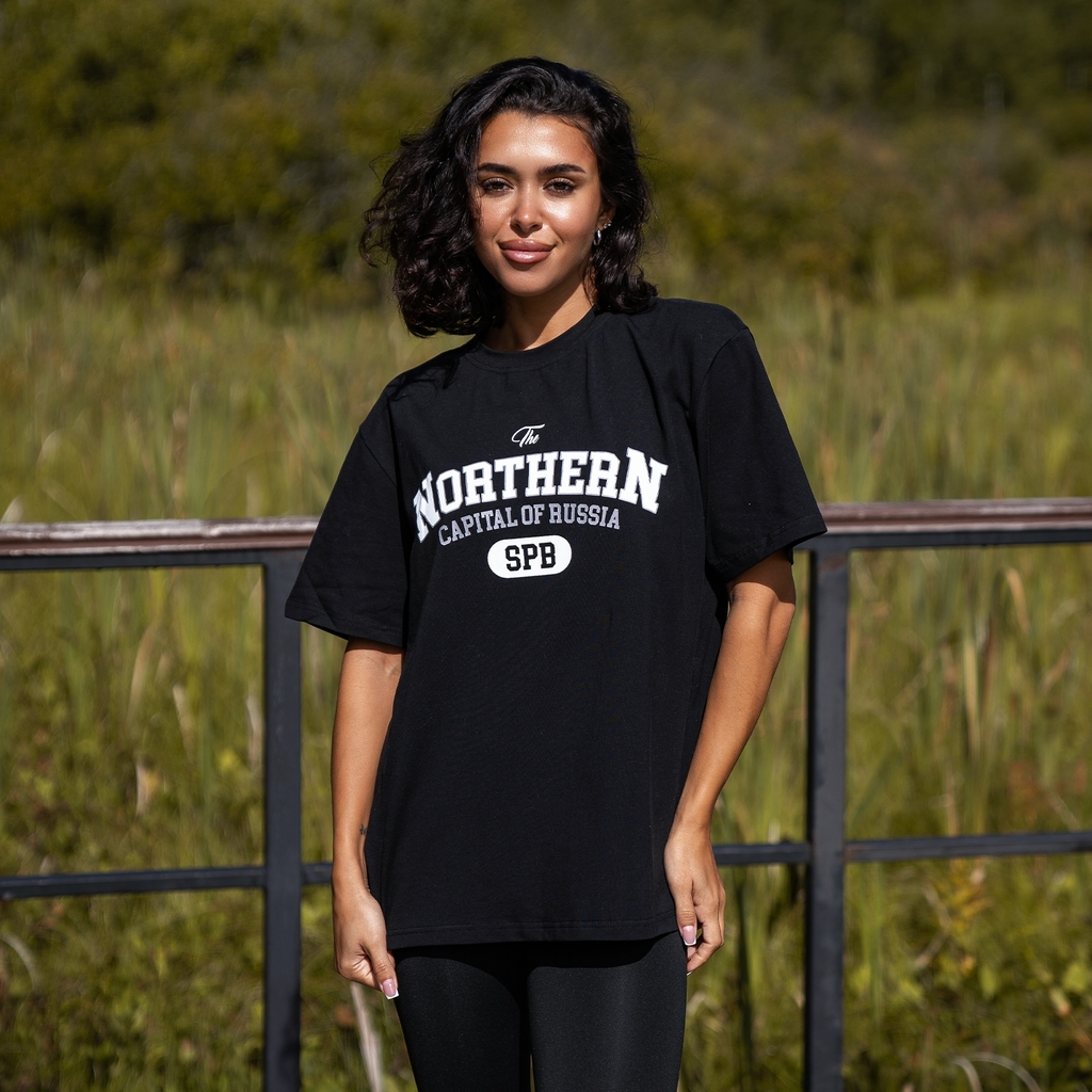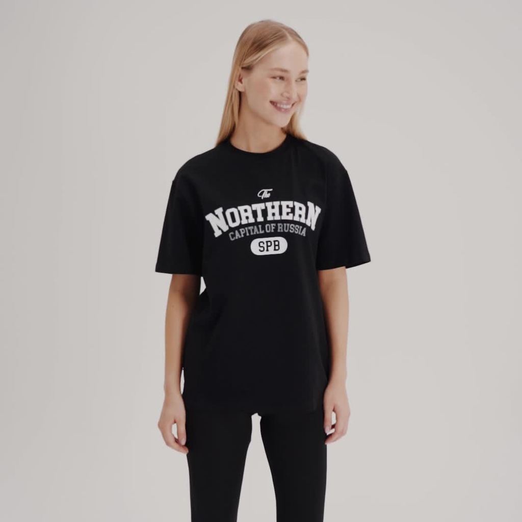 Женская футболка свободного кроя, круглый вырез горловины (принт "Northern").Материал: Cotton - материал из натуральных волокон, который удобен в носке, быстро впитывает и отводит от тела влагу, хорош... Показать описаниео пропускает воздух и не раздражает кожу. Хлопок гигиеничен, обладает устойчивостью к истиранию и разрыву, помогает балансировать температуру для избегания перегрева. В стирке требует более бережного обращения. Рекомендуется утюжить и стирать вывернутыми (особенно изделия с принтом) на изнаночную сторону при температуре 30 градусов.ВНИМАНИЕ! Оттенок цвета ткани может отличаться в зависимости от партии товара, также могут быть незначительные отличия цветовых оттенков разных деталей одного изделия. Производители ткани не считают это браком, объясняя это технологическими особенностями производства. Цветовая гамма товара может быть изменена (в рамках допуска) производителем трикотажных полотен в зависимости от серии поставки без предварительного уведомления.В связи с этим, подбор комплекта одежды в одном оттенке возможен только в процессе формирования единого заказа.Состав: 92% Cotton, 8% Elastane