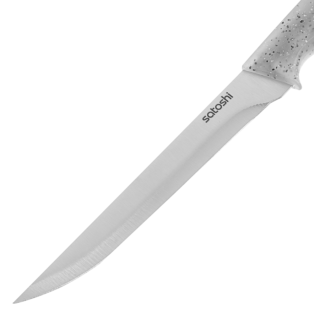 Нож кухонный универсальный SATOSHI Меллер с лезвием 12,7 см из нержавеющей стали подходит для нарезки фруктов и овощей, разделки и нарезки рыбы и мясных деликатесов, сыров и других продуктов. Геометри... Показать описаниея клинка позволяет приспособить его под любые нужды. Нержавеющая сталь обладает хорошими эксплуатационными свойствами, коррозионностойкая, износостойкая и легко поддается заточке любыми заточными инструментами. Специальное покрытие делает процесс нарезки более комфортным, так как продукты не налипают на клинок. Рукоять с покрытием soft-touch удобно фиксируется в руке, не выскальзывая в процессе использования. Универсальный нож SATOSHI имеет стильный дизайн, вписываясь в интерьер любой кухни.