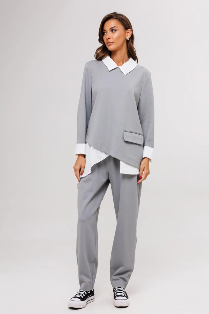 Свободный и стильный костюм для повседневного образа: Верх: асимметричный джемпер с контрастным белым воротником и вставками, создающий эффект многослойности. Декоративный карман добавляет акцента. Ни... Показать описаниез: модные кюлоты свободного кроя — тренд сезона, которые дарят комфорт и подчеркивают лёгкость силуэта. Детали: универсальный серый оттенок с белыми акцентами, который легко вписывается в капсульный гардероб. Стиль: идеально сочетается с кедами или кроссовками для повседневных луков, а также с обувью на каблуке для более элегантного варианта. ? Модный крой + комфорт на каждый день. ? Подходит для офиса, прогулок, встреч. ? Легко комбинируется с базовыми вещами. Вискоза-75%; ПЭ-25%