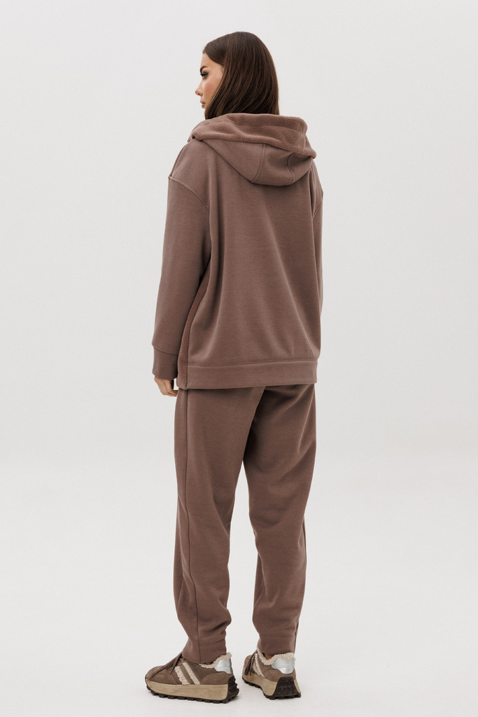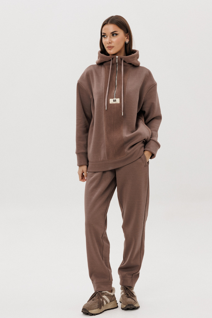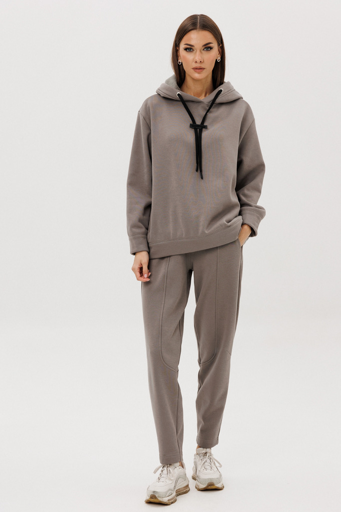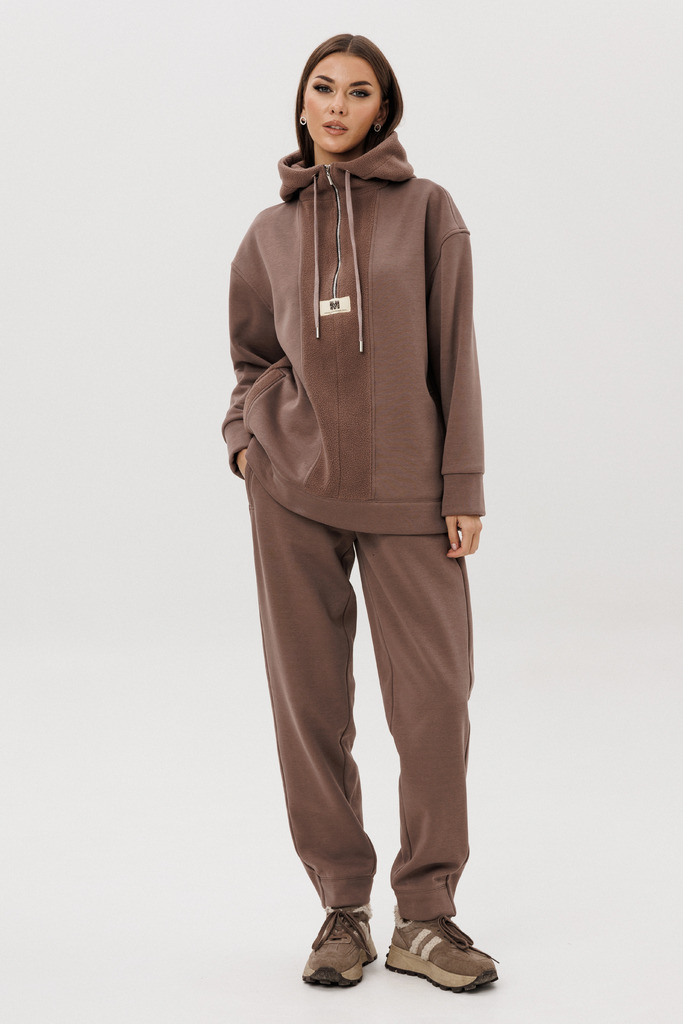 "Уютный костюм из тёплого хлопчатобумажного футера с мягким начёсом «барашек» — идеальное сочетание комфорта и современного стиля. Объёмный худи с капюшоном и контрастным шнуром создаёт расслабленный ... Показать описаниесилуэт, а брюки со слегка зауженным кроем и декоративными строчками добавляют образу актуальности. Материал приятен к телу, хорошо держит форму и дарит ощущение тепла даже в прохладную погоду. Этот костюм подойдёт как для прогулок и путешествий, так и для уютных домашних выходных." хлопок 70%,пэ 27%, эластан 3%.