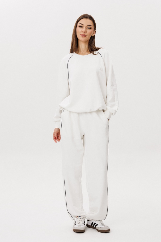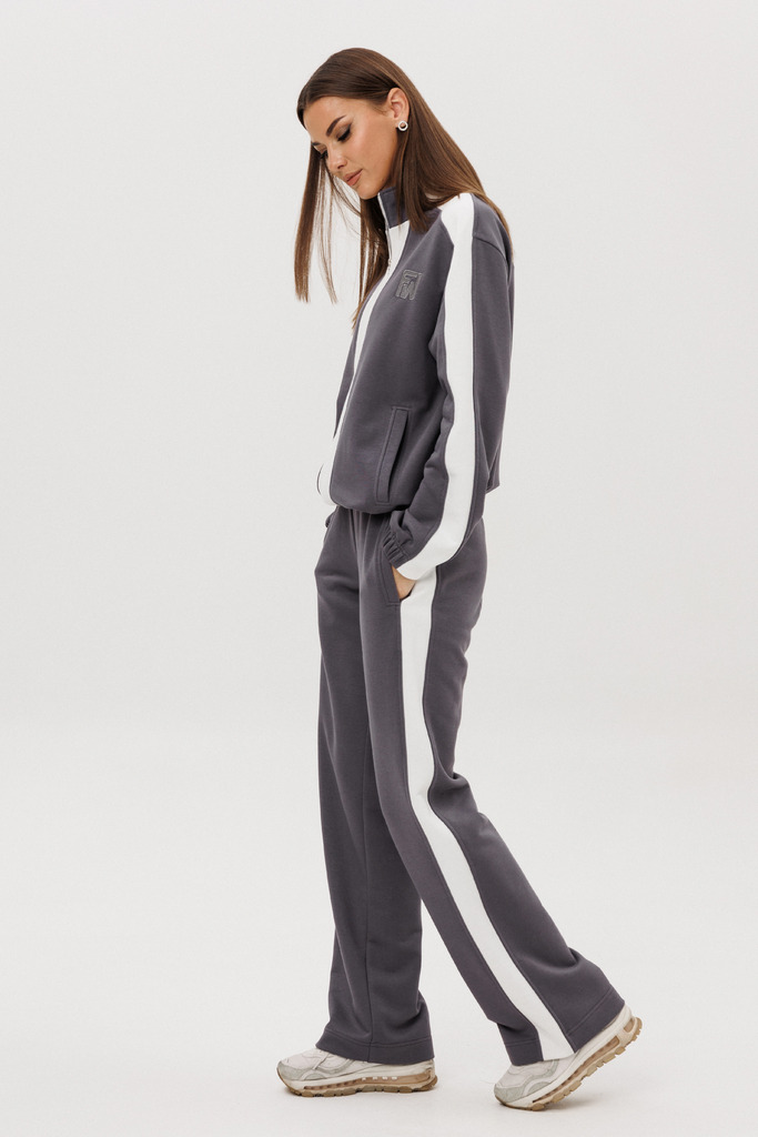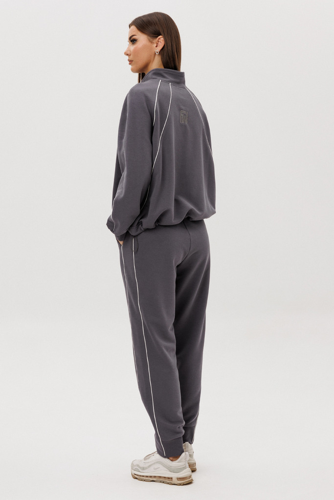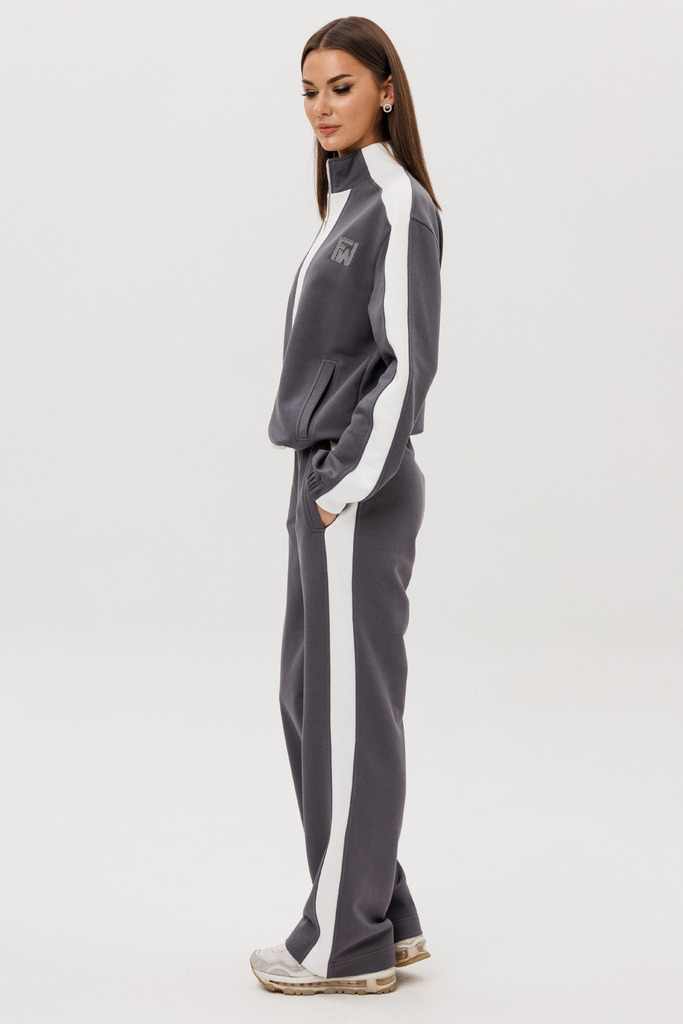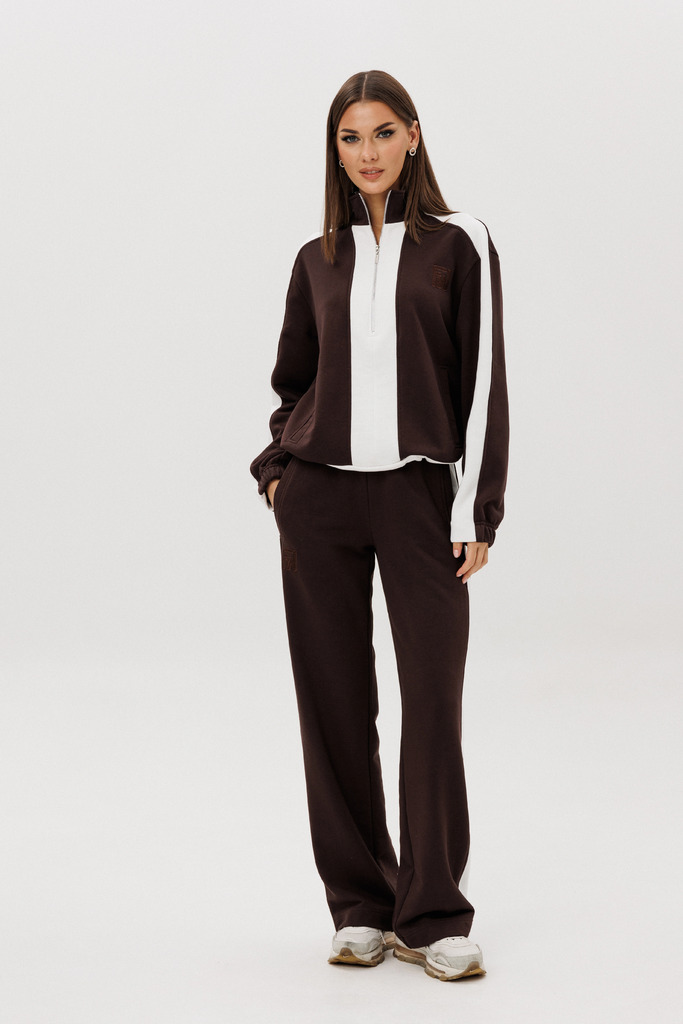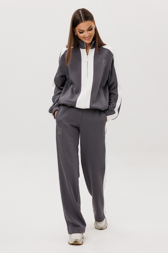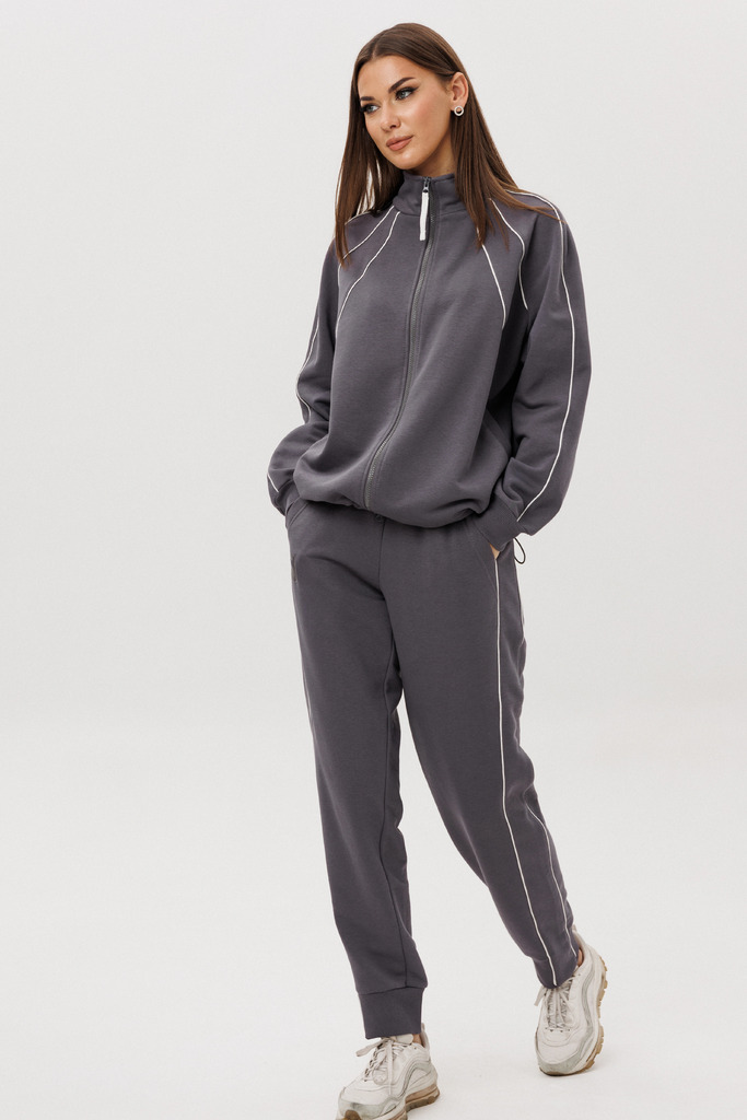 Комфорт - один из ключевых трендов современной действительности, который отлично реализуется в контексте стиля спорт-кэжуал. Его выбирает тот, кто не желает ограничивать себя жёсткими рамками, стремит... Показать описаниеся выглядеть модно и динамично и не считает, что красота требует жертв. Свободный, упрямлённый свитшот с заниженной линией плеча, воротником-стойкой, частичной застёжкой на тесьму-молнию, прорезными карманами, рукавом, состоящим из 3-х частей с притачной манжетой и кулисой с регулирующей эластичной тесьмой и фиксаторами по низу изделия. Брюки свободные, прямые на притачном эластичном поясе с контрастными лампасами и карманами с листочками в боковых швах. Контрастные лампасы на брюках, рукавах, по центру переда и низу придают модели особую динамичность и изысканность. Длина свитшота около 62 см. Длина рукава с плечом около 76 см. Длина брюк около 104 см. хлопок 70%,пэ 27%, эластан 3%.