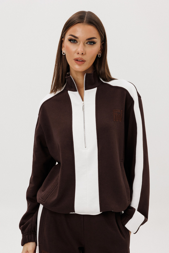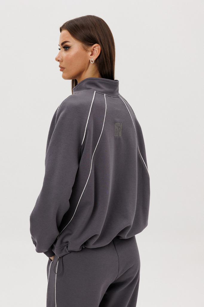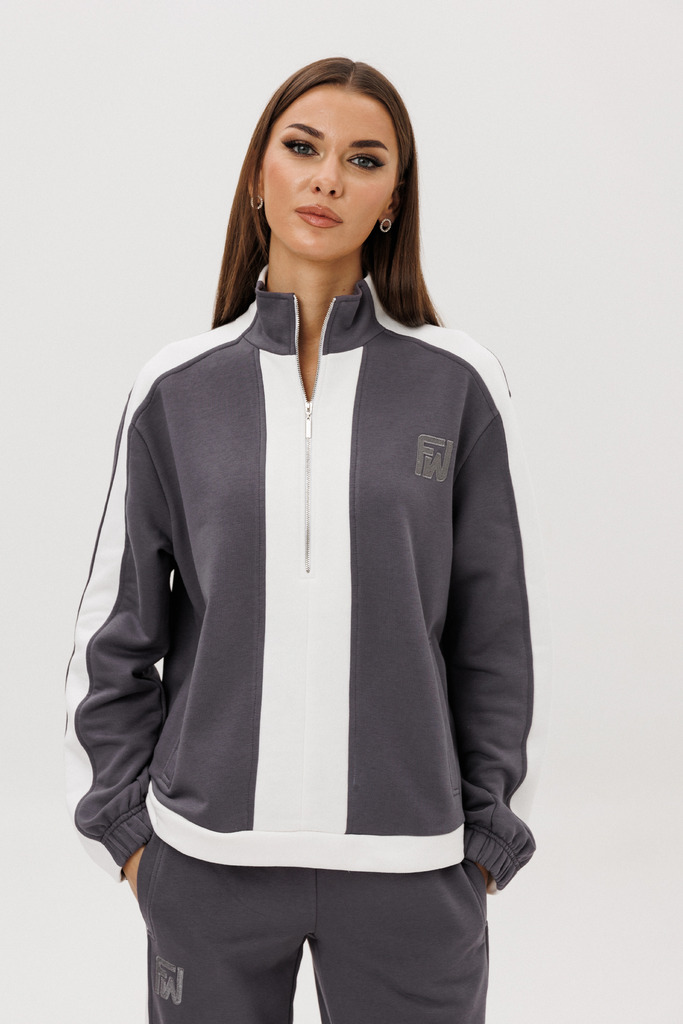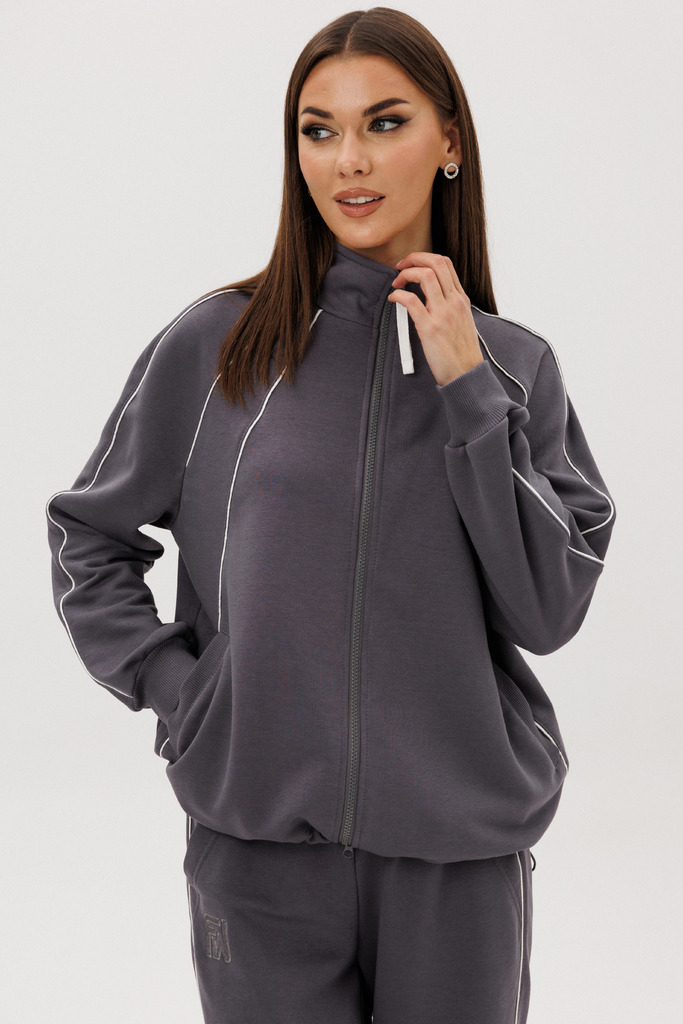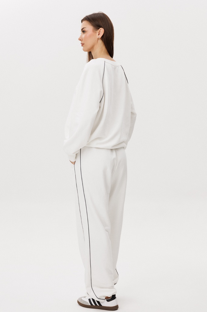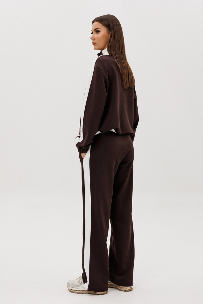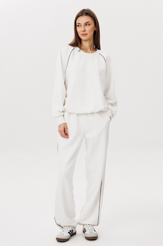 Комфорт - один из ключевых трендов современной действительности, который отлично реализуется в контексте стиля спорт-кэжуал. Его выбирает тот, кто не желает ограничивать себя жёсткими рамками, стремит... Показать описаниеся выглядеть модно и динамично и не считает, что красота требует жертв. Свободный, упрямлённый свитшот с заниженной линией плеча, воротником-стойкой, частичной застёжкой на тесьму-молнию, прорезными карманами, рукавом, состоящим из 3-х частей с притачной манжетой и кулисой с регулирующей эластичной тесьмой и фиксаторами по низу изделия. Брюки свободные, прямые на притачном эластичном поясе с контрастными лампасами и карманами с листочками в боковых швах. Контрастные лампасы на брюках, рукавах, по центру переда и низу придают модели особую динамичность и изысканность. Длина свитшота около 62 см. Длина рукава с плечом около 76 см. Длина брюк около 104 см. хлопок 70%,пэ 27%, эластан 3%.