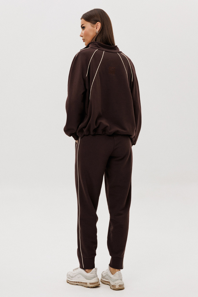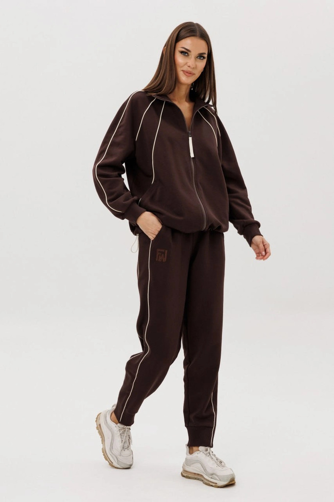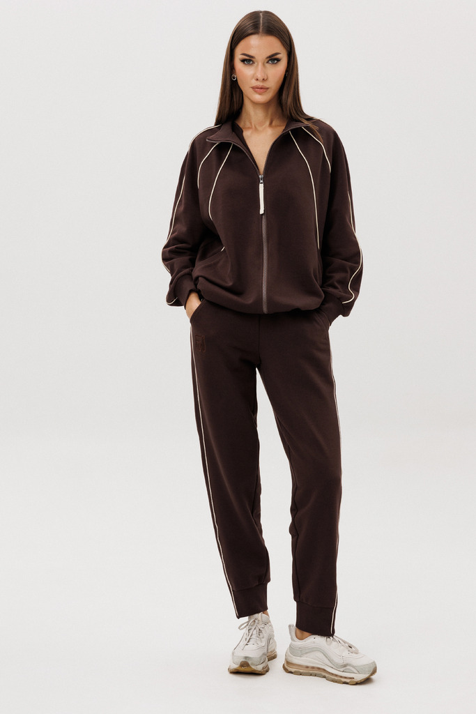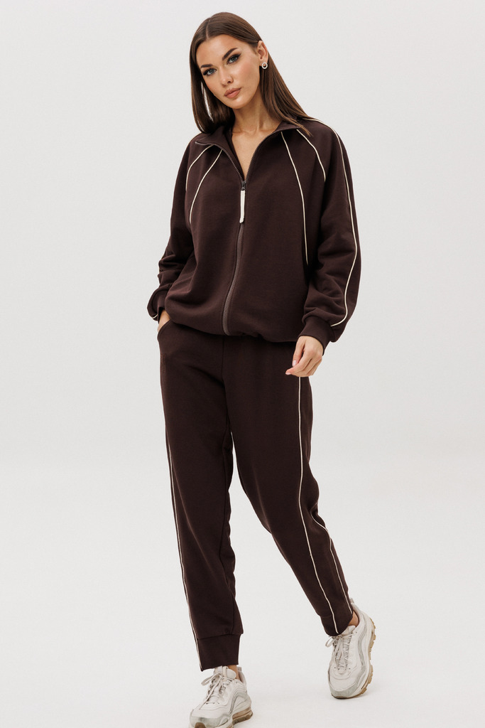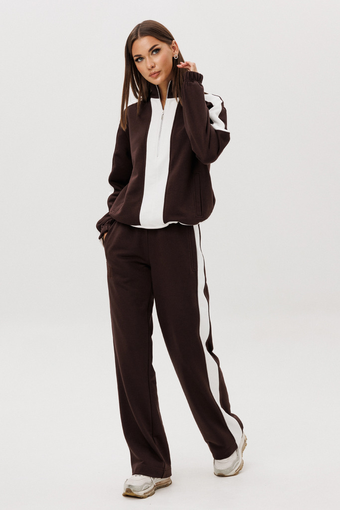 Современный костюм в стиле спорт-кэжуал — идеальный баланс комфорта и актуального дизайна. Модель выполнена из мягкого трикотажного полотна с добавлением хлопка, обеспечивающего приятные тактильные ощ... Показать описаниеущения и свободу движений. Джемпер покроя реглан с аккуратной стойкой и застёжкой-молнией украшен контрастными кантами, придающими образу динамику. Брюки со слегка зауженным силуэтом и манжетами по низу дополнены эластичным поясом для удобной посадки. Костюм легко интегрируется в повседневный гардероб — от прогулок до путешествий и отдыха в городе. хлопок 70%,пэ 27%, эластан 3%.