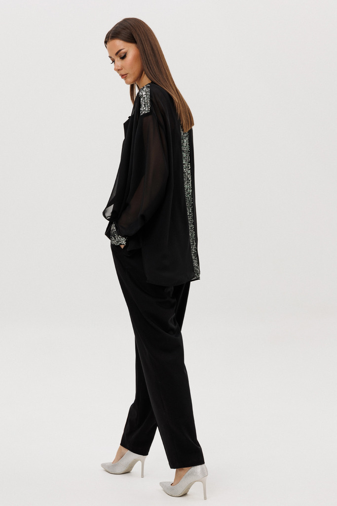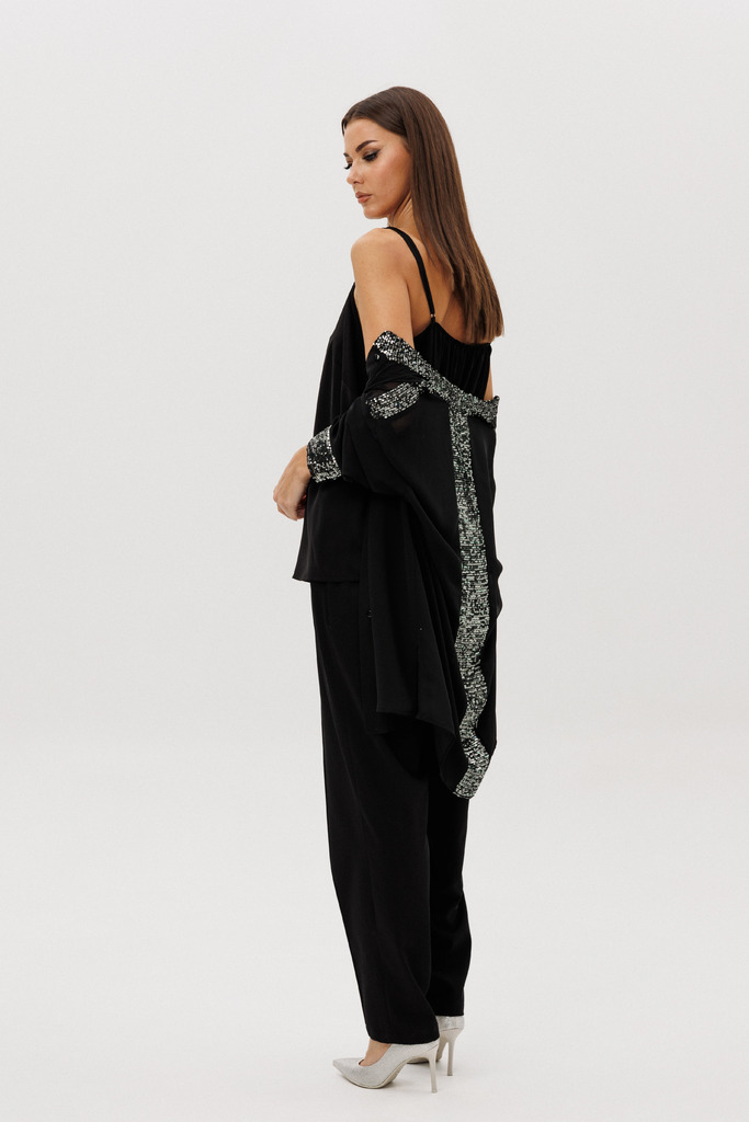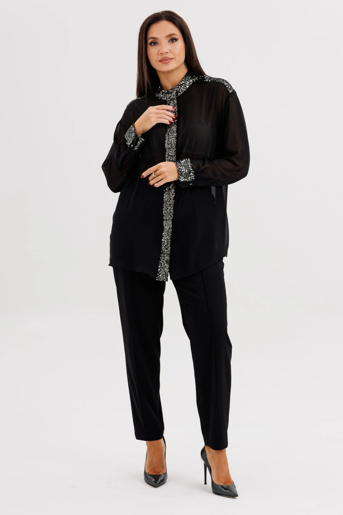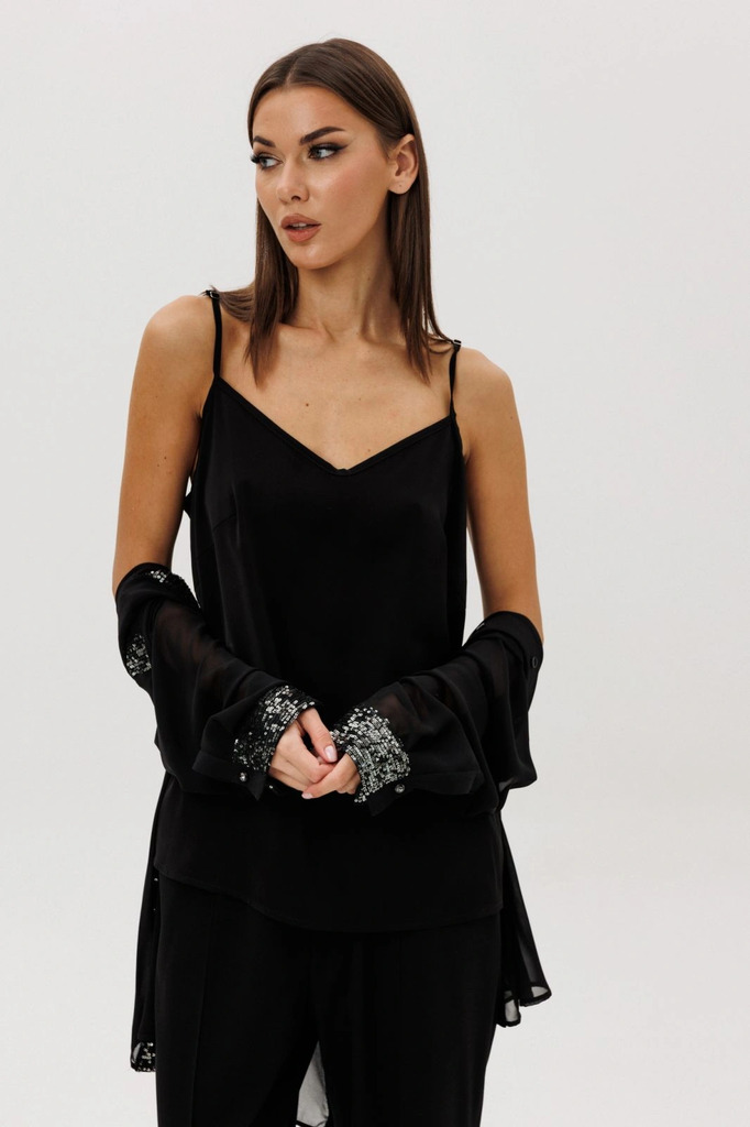 Эффектный брючный комплект-тройка — воплощение современного стиля с ноткой вечерней элегантности. Лёгкая шифоновая блуза свободного покроя украшена изысканной отделкой пайетками по линии борта и манже... Показать описаниетам, создавая тонкий блеск и игру света в движении. Атласный топ на регулируемых бретелях добавляет мягкого женственного сияния и комфортно садится по фигуре. Брюки из поливискозного полотна со стрелками и эластичным поясом завершают образ, сочетая удобство и безупречный силуэт. Идеальный выбор для вечернего выхода, праздничного события или стильной городской прогулки — этот костюм легко адаптируется под настроение и аксессуары. Рубашка ПЭ 100%? Топ ПЭ 100% Брюки ПЭ 64%, вискоза 34%, спандекс 2%