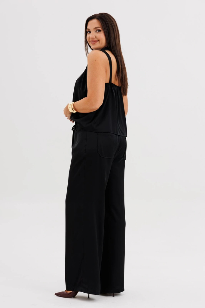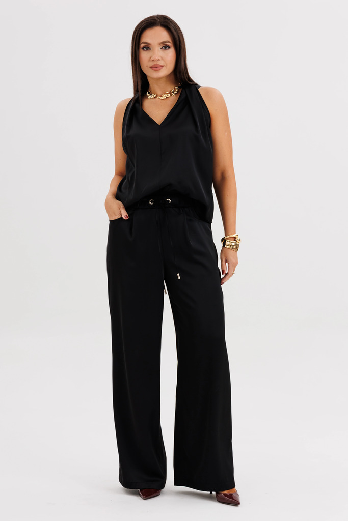 Стильный брючный комплект, выполненный из гладкого атласного полотна, воплощает современную элегантность и утончённую простоту. Эффектная блуза без рукавов с V-образным вырезом мягко драпируется по фи... Показать описаниегуре, придавая образу лёгкость и женственность. Брюки свободного силуэта с комфортным поясом на кулиске подчёркивают расслабленный шик и создают безупречный силуэт. Благородный блеск ткани делает комплект идеальным решением как для вечерних выходов, так и для стильных повседневных образов. Добавь яркие аксессуары — и ты получишь образ, в котором комфорт гармонично сочетается с чувственностью и уверенностью. вискоза 75%, ПЭ 25%