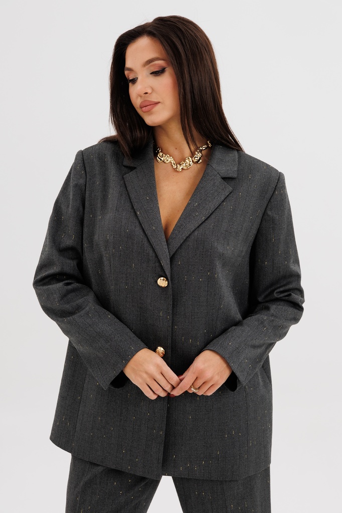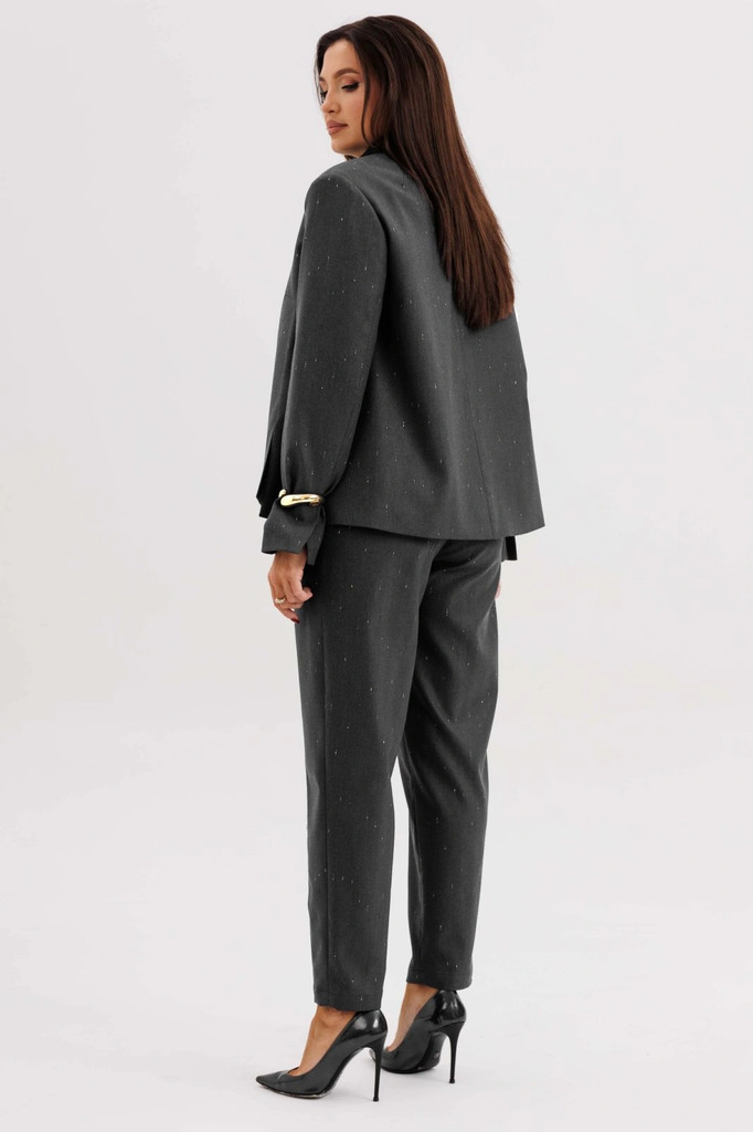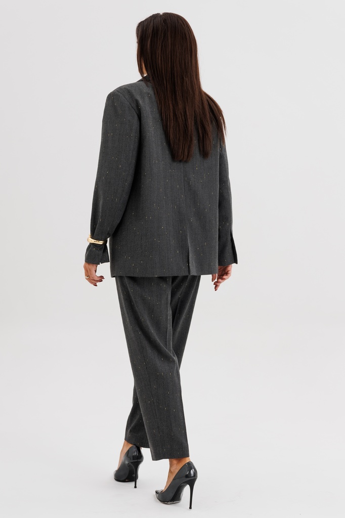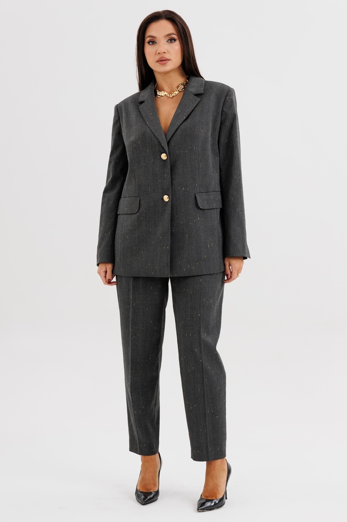 Костюмный тренд - это максимум стиля и практичности, особенно если носить их в неформальной обстановке. Это настоящий casual-шик, который легко трансформируется в вечерний образ. Жакет из необычного п... Показать описаниео текстуре материала с вкраплением пайетки, брюки из полотна без пайетки. Полуприлегающий силуэт пиджака с центральной застёжкой, круглым вырезом горловины и втачным покроем. Полочка с фигурным рельефом, спинка с фигурным рельефом, центральным швом и плечевыми вытачками. Рукав двухшовный. Брюки-палаццо широкие внизу и прилегающие вверху, с талиевыми вытачками по передним и задним половинкам. Застёжка по боковому шву. Длина жакета около 54 см. Длина рукава около 62 см. Длина брюк около 108 см. пэ 64%, вискоза 34%, спандекс 2%.