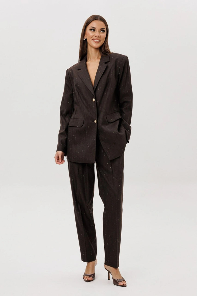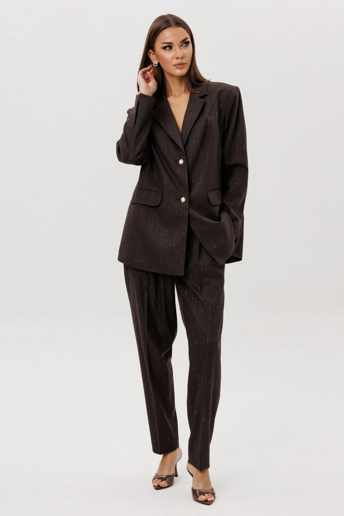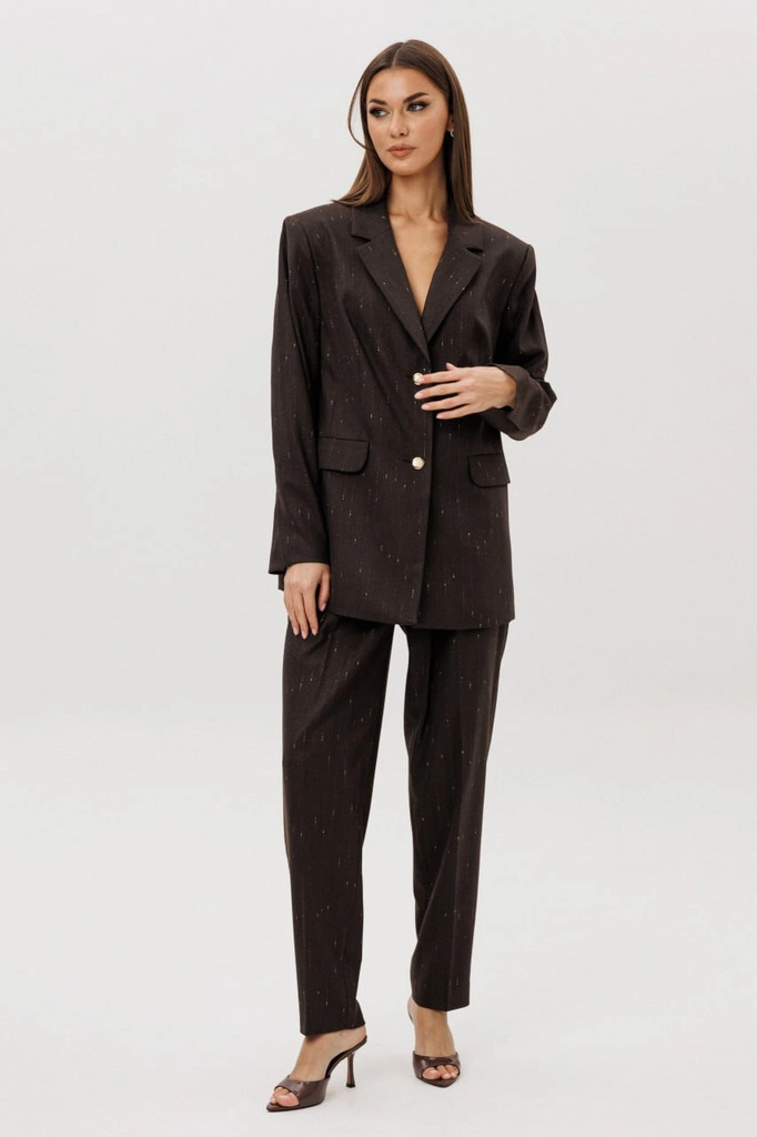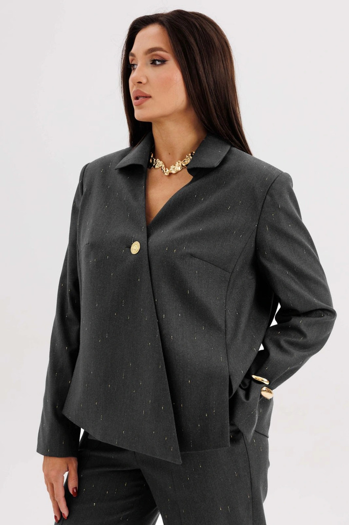 Элегантный брючный костюм из поливискозной ткани с лёгким вкраплением люрекса — выбор современных женщин, ценящих утончённый стиль и комфорт. Жакет прямого силуэта выполнен с необычной асимметричной л... Показать описаниеинией борта, которая добавляет образу индивидуальности и лёгкий дизайнерский акцент. Застёжка на крупные декоративные пуговицы придаёт образу выразительность. Брюки со стрелками и аккуратной посадкой по фигуре визуально вытягивают силуэт, создавая гармоничные пропорции. Костюм идеально подойдёт для офисных будней, деловых встреч и стильных повседневных выходов. В нём каждая деталь работает на образ — от благородного оттенка ткани до мягкого блеска люрекса. ПЭ 64%, вискоза 34%, спандекс 2%