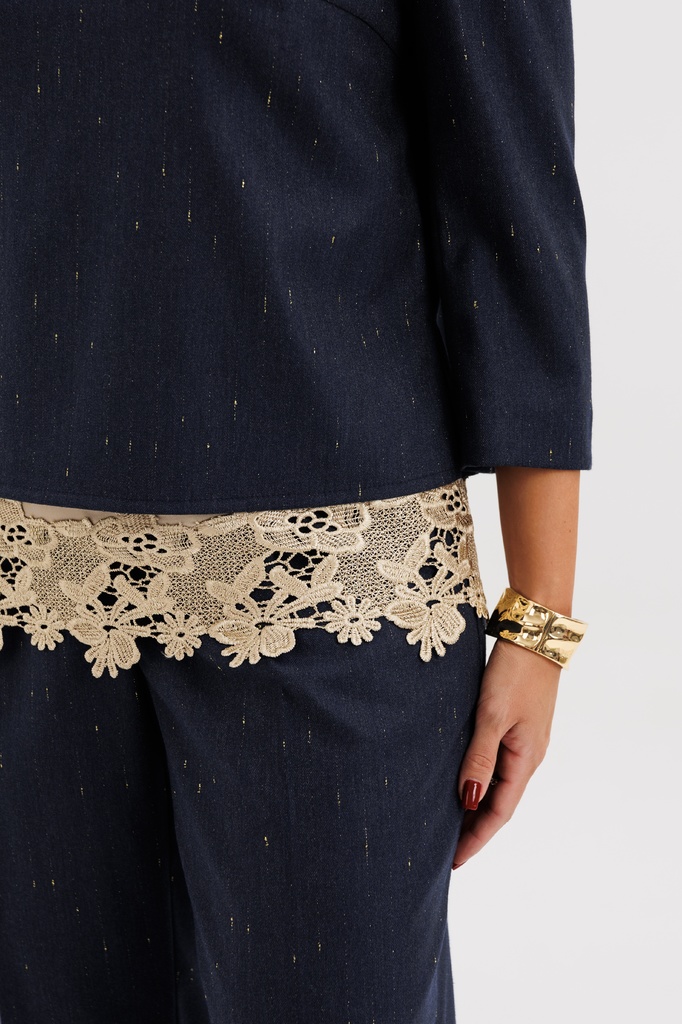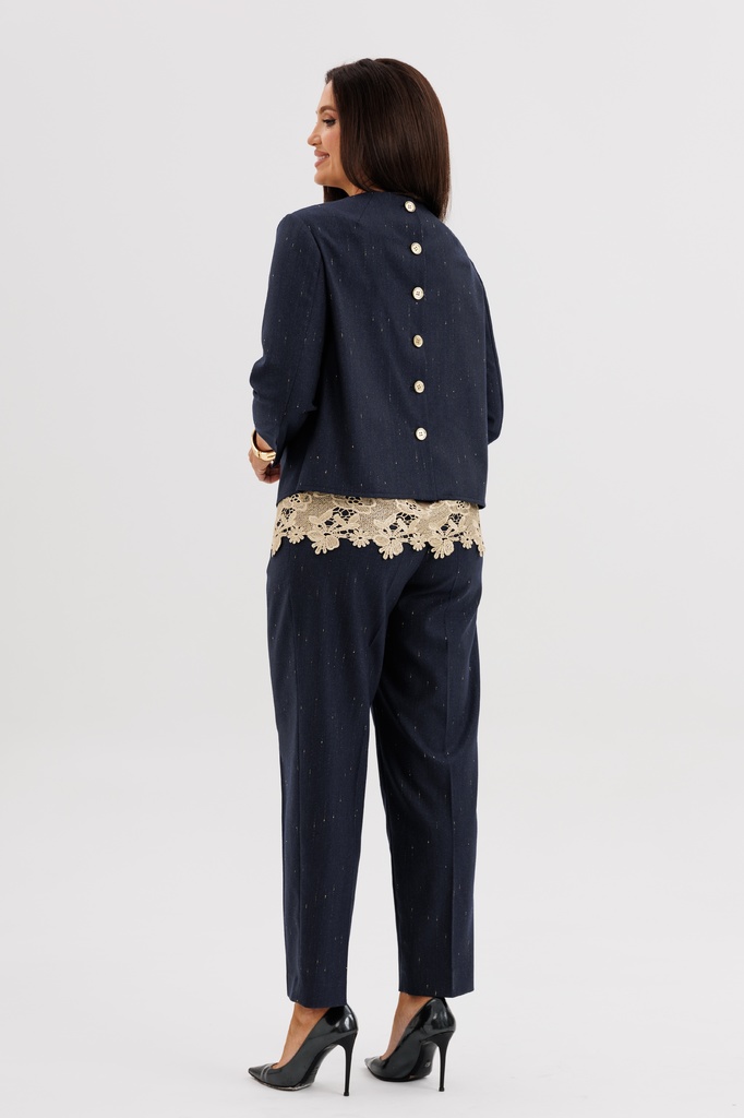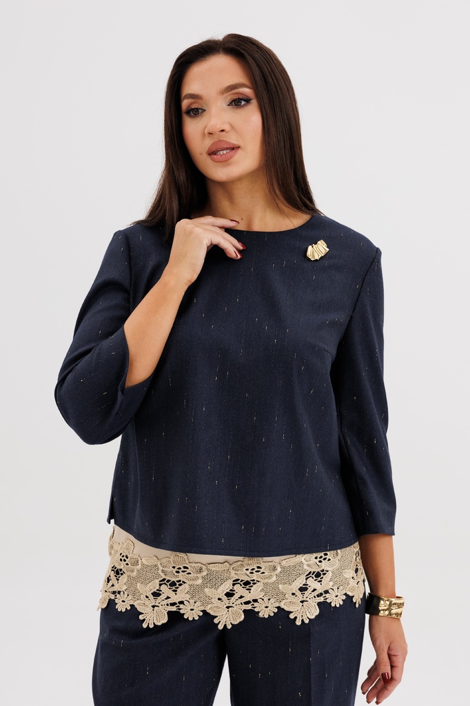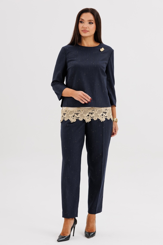 Утончённый и женственный костюм, созданный для особых случаев и стильных будней. Мягкое мерцание люрексовой нити в поливискозной ткани придаёт образу изысканное сияние, а продуманный крой обеспечивает... Показать описание идеальную посадку и комфорт. Главный акцент комплекта — нижний атласный топ с роскошной кружевной отделкой, создающий эффект многослойности и добавляющий наряду нотку романтичности. Верхняя блуза с рукавом ? лаконична и элегантна, а прямые брюки визуально вытягивают силуэт, делая образ стройнее и гармоничнее. Такой ансамбль станет отличным выбором для торжеств, встреч и особых случаев, когда хочется подчеркнуть вкус и женственность. ? Современная классика в лучших традициях элегантного стиля. Костюм ПЭ 64%, вискоза 34%, спандекс 2% Топ ПЭ 100%?