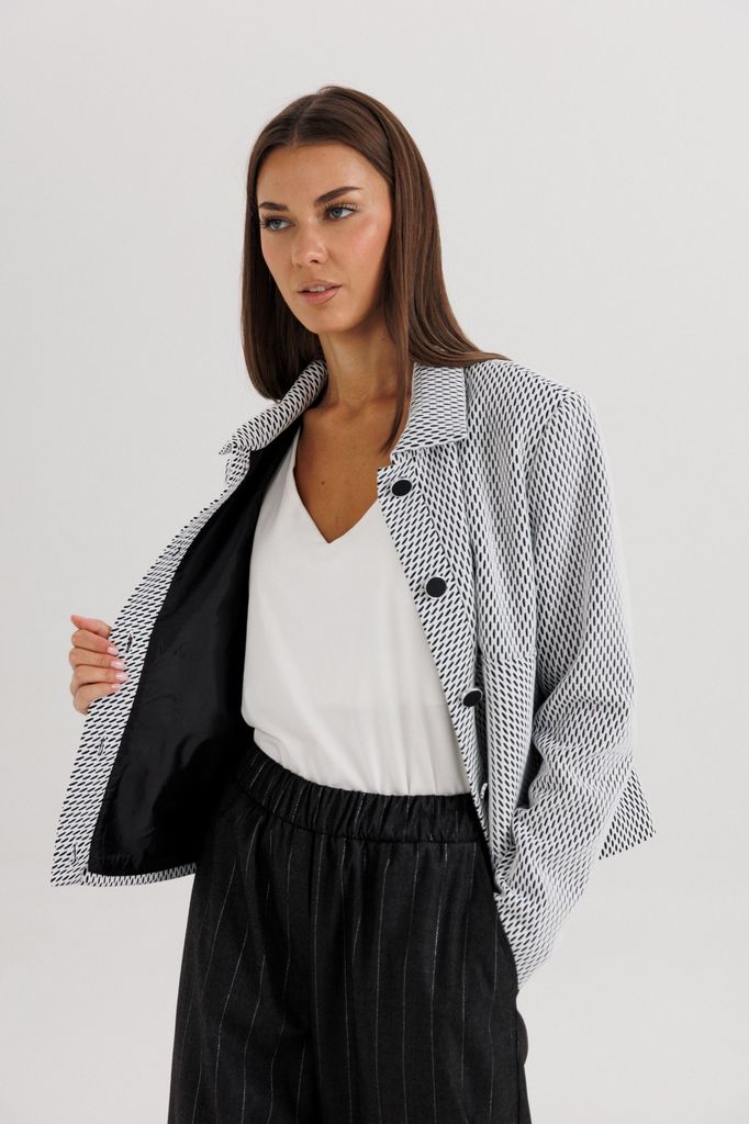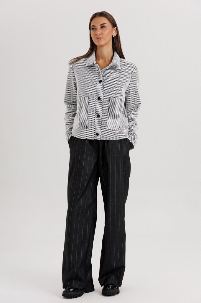 Современный женский костюм в стиле smart casual сочетает элегантность классики и комфорт повседневного образа. Комплект состоит из жакета прямого кроя с крупными пуговицами и брюк в тон... Показать описаниекую вертикальную полоску. Контраст текстур придаёт образу динамичность и стиль. Жакет укороченной длины выполнен из лёгкой ткани с графическим узором, имеет отложной воротник и аккуратную застёжку на пуговицы. Брюки прямого силуэта со стрелками и комфортной посадкой по талии визуально вытягивают силуэт и добавляют стройности. Костюм универсален — идеально подходит для офиса, деловых встреч и городских выходов. Его можно сочетать с лоферами, туфлями на каблуке или кроссовками для более расслабленного стиля. Особенности модели: Комплект: жакет + брюки Стильный контрастный дизайн Прямой силуэт и длина брюк миди Классическая полоска — тренд сезона 2025 Удобная посадка и лаконичный крой Жакет: вискоза 75%, ПЭ 25% Брюки: ПЭ 64%, вискоза 34%, спандекс 2%