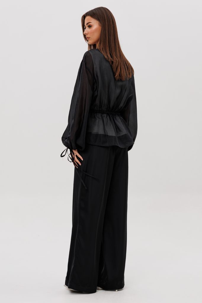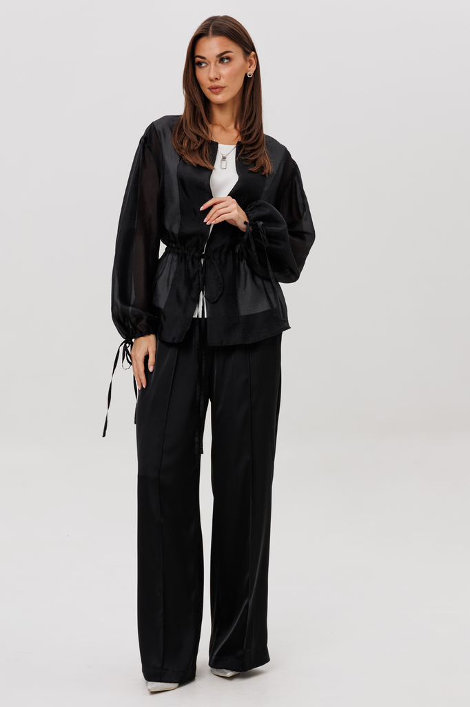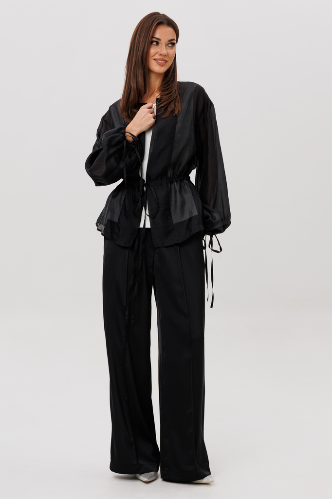 Эффектный ансамбль-тройка, в котором каждая деталь работает на утончённый и современный образ. Полупрозрачный блузон из воздушной вискозной органзы создаёт легкую дымку и добавляет образу благородной ... Показать описаниезагадочности, а акцентные завязки подчёркивают талию и делают силуэт более выразительным. Контрастный атласный топ вносит нотку сияния и гармонично освежает тёмную гамму комплекта. Широкие атласные брюки со стрелкой и комфортным эластичным поясом добавляют образу сдержанной элегантности и подчёркивают его продуманную роскошность. Такой комплект смотрится нарядно, современно и effortlessly chic — идеальный выбор для тех, кто любит сочетание лёгкости, динамики и безупречного стиля. ПЭ 100%