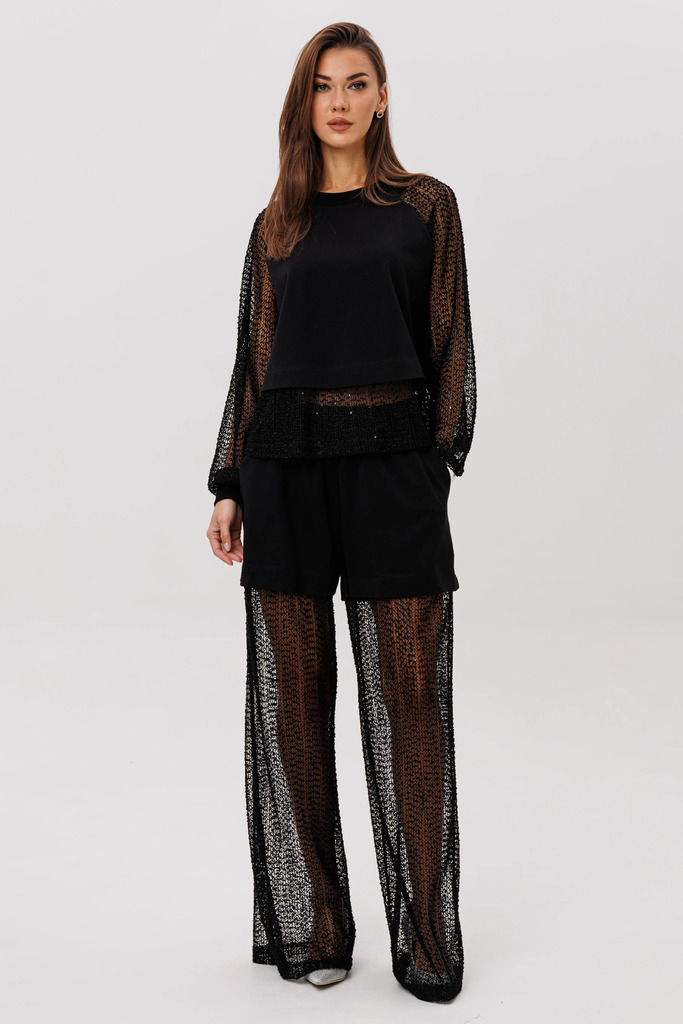 Современный брючный комплект, который создаёт эффект многослойности и лёгкого сияния. Джемпер выполнен из мягкого, комфортного вискозного полотна с нейлоном и дополнен воздушными рукавами из мерцающей... Показать описание сетки с россыпью микропайетки. Брюки на удобном эластичном поясе имеют прозрачную нижнюю часть в тон — подвижную, блестящую и подчёркивающую силуэт. Стильное решение для тех, кто ценит тренды и оригинальное звучание образа. вискоза 75%, ПЭ 25%
