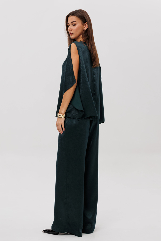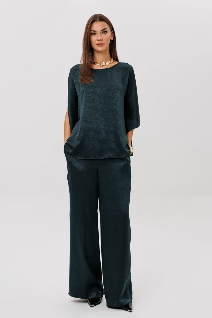 Роскошный брючный комплект из высококачественного атласа — это готовый образ для особых случаев и стильных выходов. Свободная блуза beautifully драпируется, мягко играет на свету и позволяет носить её... Показать описание как в расслабленном варианте, так и подчёркивая талию поясом. Широкие брюки на комфортной резинке создают эффект удлинённых ног и дарят полную свободу движений. Современная элегантность, которая всегда смотрится дорого и effortlessly chic. ПЭ 100%