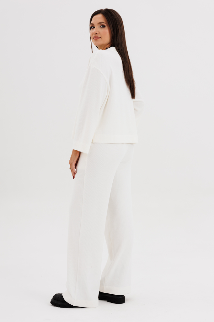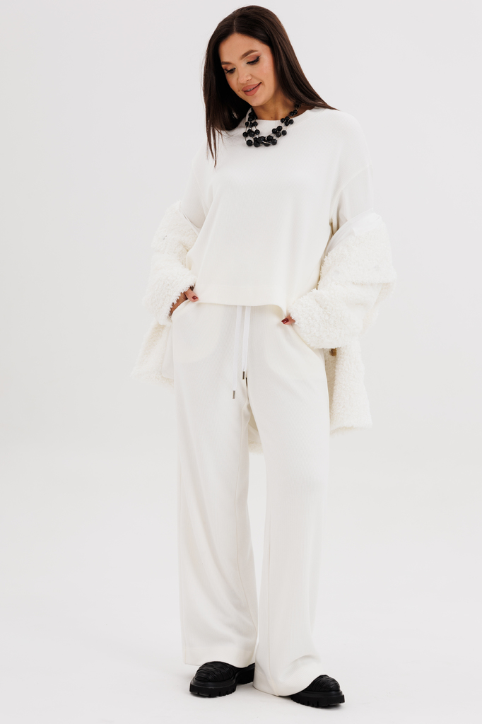 Это просто роскошный минимализм. Классика на новый манер. Одежда приближает нас к естественности и непринужденности. Спокойная палитра: В вашем распоряжении молочно-белый и теплый оттенок бежевого. Хо... Показать описаниечется быть собой, никуда не торопиться. Эта невероятная модель комплекта сохраняет равновесие в образе, хотя в ней есть и скрытая чувственность и внутренний аристократизм. Свободный упрямленный джемпер из шелковой вискозы создает ощущение прохлады, даже в жаркий день. Комфортная заниженная линия плеча и рубашечный рукав дают неограниченные возможности и свободу движения. Брюки в расслабленном стиле, на притачном эластичном поясе, с наклонными боковыми карманами и защипом по центру передних половинок, визуально удлиняющих ноги. Брюки заужены к низу, из удивительно комфортного вискозного трикотажного полотна с нейлоном, который хорошо держит форму, и совершенно не оставляет растянутости в процессе эксплуатации. Длина джемпера около 72 см. Длина рукава с плечом около 74 см. Длина брюк около 100 см. Джемпер: хлопок 45%, вискоза 55% Брюки: ПЭ 64%, вискоза 34%, спандекс 2%