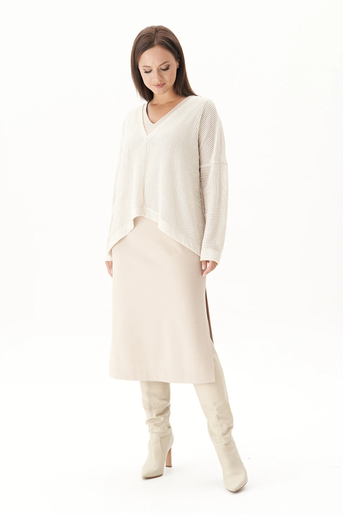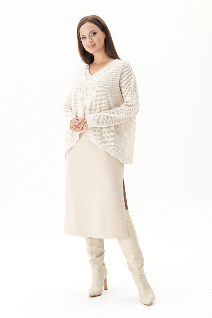 Тренд на готовый костюм с платьем - идеальное решение для тех, кто не хочет отказываться от мягкости и уюта трикотажного полотна, а также сохраняет своё время. Такой комплект создаёт максимально тёплы... Показать описанией, элегантный и одновременно стильный образ.В нем можно пойти как на праздник так и красиво и элегантно выйти в город или сходить на работу.Платье без рукава с треугольным вырезом горловины. Полочка с нагрудными вытачками. Спинка с центральным швом, талиевыми вытачками и потайной молнией.Джемпер свободного силуэта, из трикотажной фактурной сетки с металлическим напылением. Покрой свободный с заниженной линией плеча. платье: пэ 64%, вискоза 34%, спандекс 2% джемпер: 20% хлопок, 80% пэ.