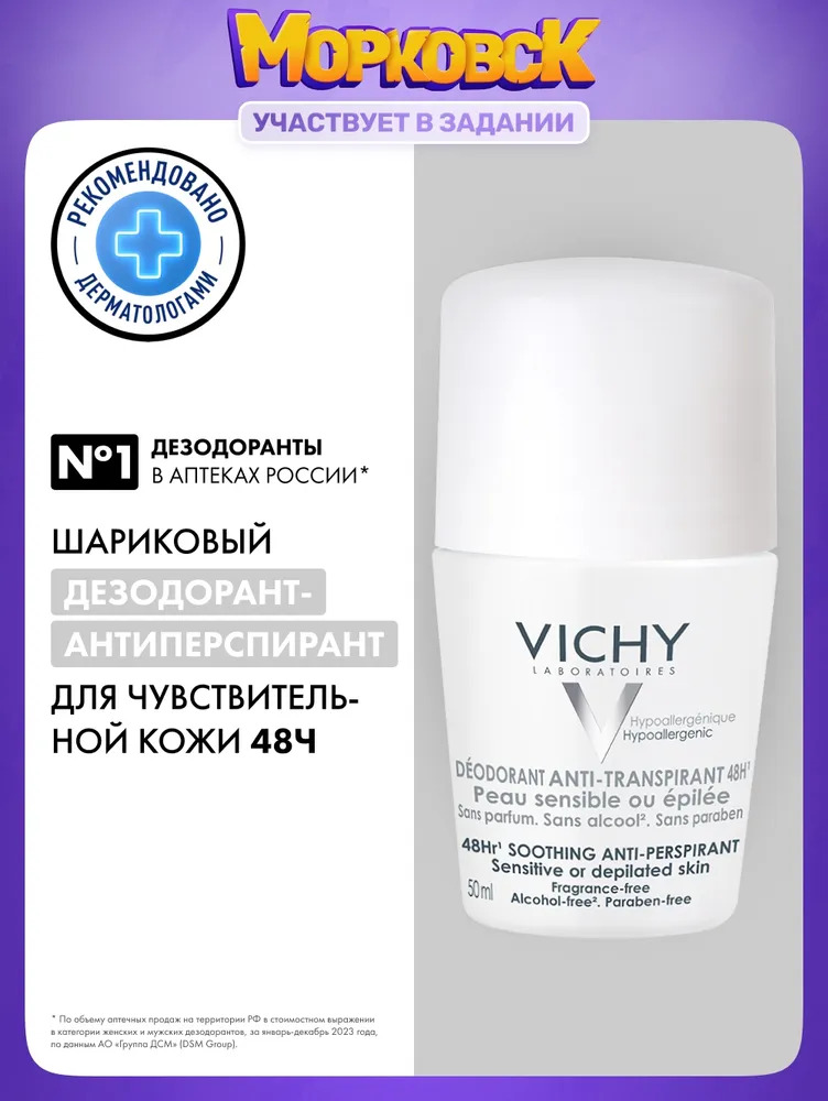 VICHY Дезодорант-антиперспирант 48ч шариковый против белых и желтых пятен, 50 мл.Вопросы по товару