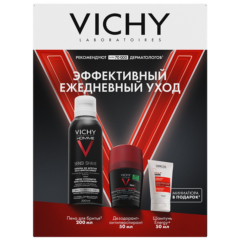 В набор входят три средства: Пена для бритья против раздражения кожи, 200 мл. Мужская пена для бритья обеспечивает гладкое скольжение лезвия по коже, позволяя бриться без раздражений и покраснений. Во... Показать описаниесстанавливает барьерно-защитные свойства кожи, увлажняет, обеспечивает антибактериальный эффект. Гипоаллергенная формула. Без парабенов. Протестировано под контролем дерматологов. Дезодорант-антиперспирант Clinical Control 96 ч, 50 мл. Средство с антибактериальными компонентами обеспечивает максимальный среди дезодорантов Vichy уровень защиты для мужской кожи. Антиперспирант - формула с клинически доказанной эффективностью обеспечивает сухость кожи в зоне подмышек и защищает от избыточного потоотделения до 96 часов.* Дезодорант - цинк в составе ограничивает размножение бактерий и защищает от неприятного запаха до 72 часов.** Двойное действие для ощущения комфорта в течение всего дня после использования. Гипоаллергенно. Шампунь тонизирующий с Аминексилом от выпадения волос. 200 мл Формула шампуня Energy+ содержит активные компоненты, воздействующие на кожу головы, корни волос и стержень волоса. Подходит для частого применения. Гипоаллергенно. Протестировано под контролем дерматологов. Можно использовать при чувствительной коже головы. Рекомендуется использовать в сочетании со средством против выпадения волос Aminexil Intensive 5 для мужчин и женщин.