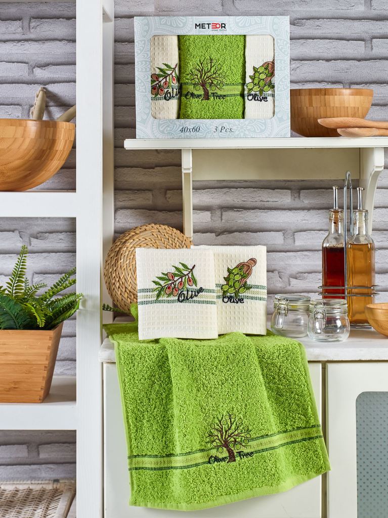 11007 MIMOZA ZEYTINL Махра-Вафля  (40х60)х3шт в коробке Набор кухонный Метеор