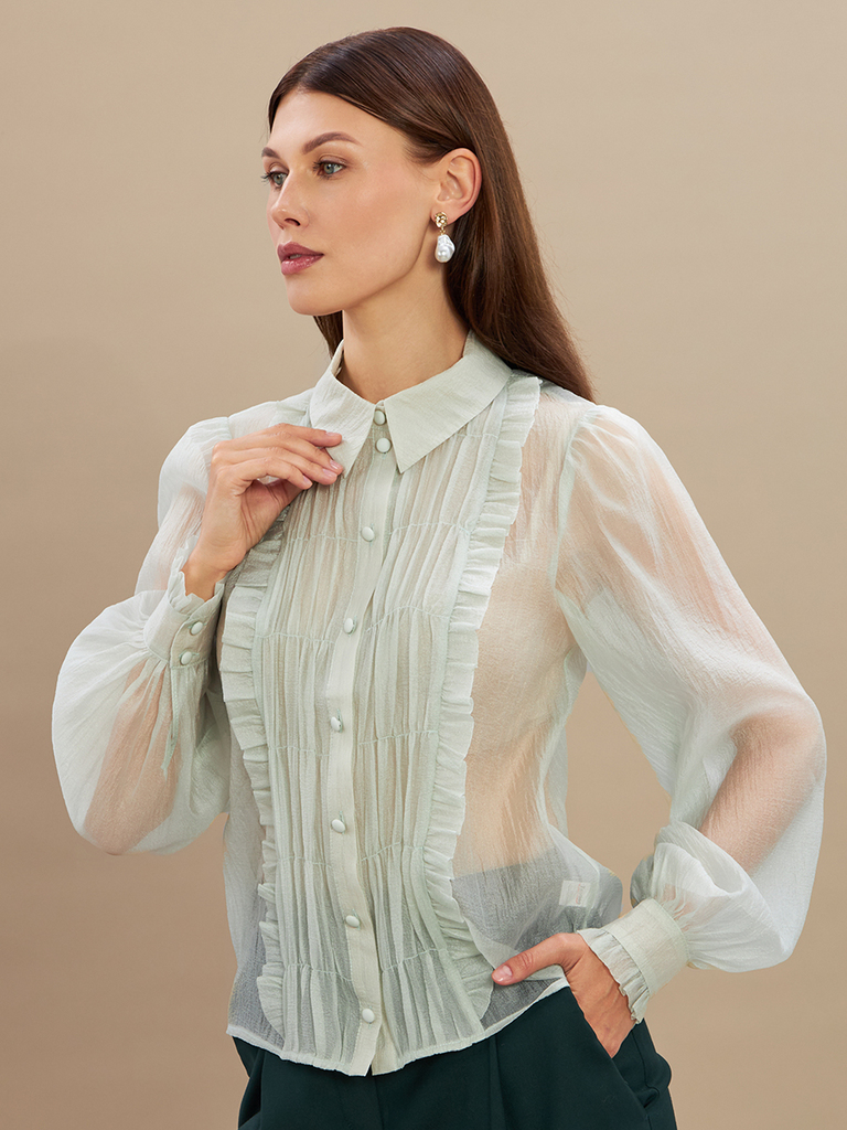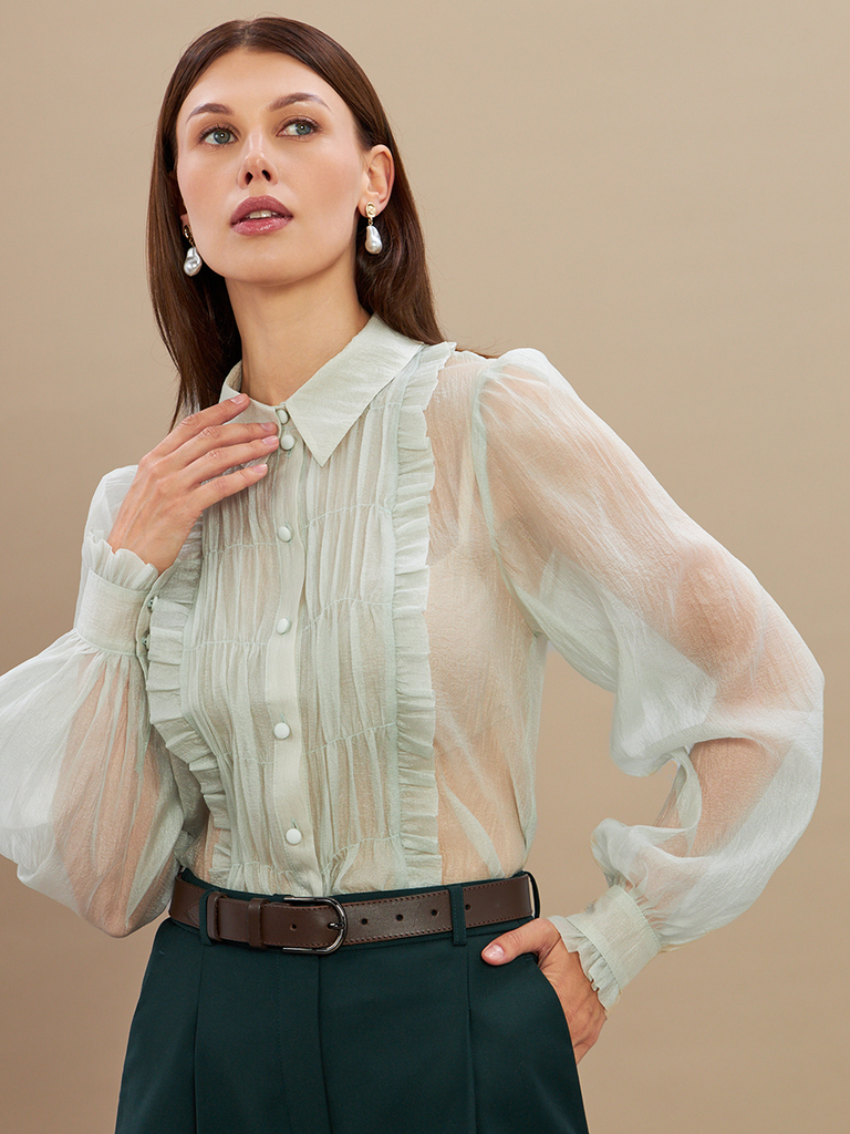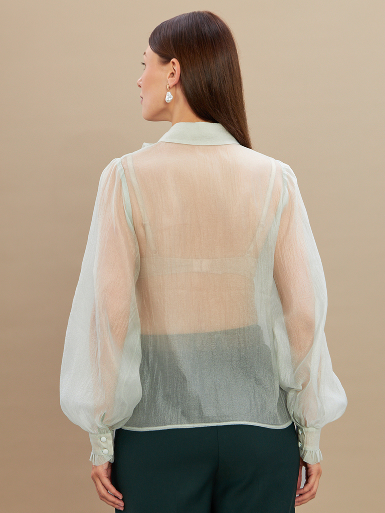 Блузка из органзы с бархатной завязкой и защипами OD-951-2 серо-зеленыйВопросы по товару