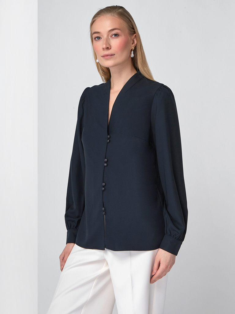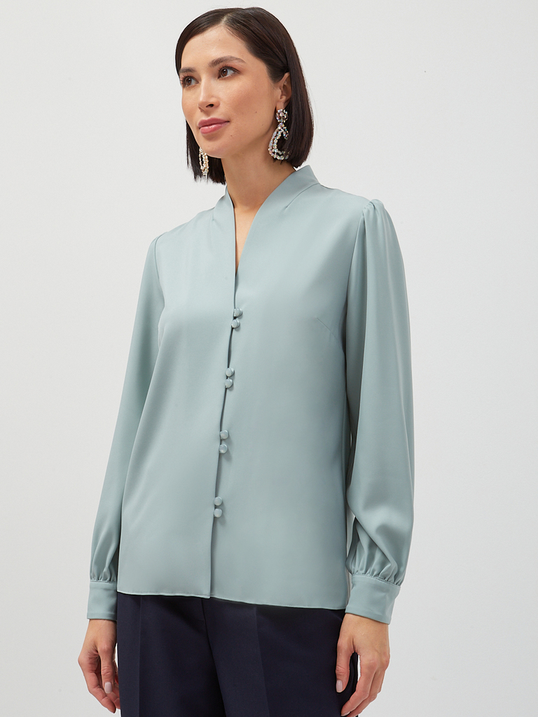 Состав: 45% полиэстер, 35% вискоза, 20% шелк,. Материал: Вискоза, Полиэстер, Шелк. Длина по спинке: 63 см. Длина рукава: 68,6 см. Принт: Однотонный. Рукав: Длинный. Сезон: Осень, Весна, Зима. Силуэт: ... Показать описаниеПрямой. Стиль: Повседневный, Деловой, Вечерний. Тип горловины: V-образный. Блузка прямого силуэта. Из однотонной блузочной ткани. Воротник-стойка с V-образным вырезом.Рукав втачной, длинный со сборкой по плечу и по низу, на манжете. Застежка на навесные петли и пуговицы на ножке. Рост модели 170 см. Изделие на модели 42 р-ра. Длина изделия по спинке 63 см. Подробное описание: https://seller.tantino.ru/bluza-s-vyrezom-7.html