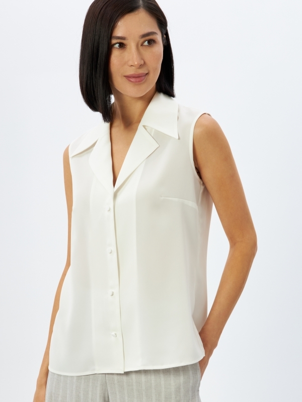 Материал: Полиэстер. Состав: 100% полиэстер. Блузка из однотонной легкой ткани. Без рукавов. Прямой силуэт. Английский удлиненный воротник. Застежка на петли и пуговицы на ножке. Разрезы в боковых шва... Показать описаниех. Рост модели 170 см. Изделие на модели 42 р-ра. Длина изделия по спинке 60 см. Подробное описание: https://seller.tantino.ru/bluzka-bez-rukavov-od-970-1-belyj.html