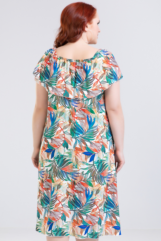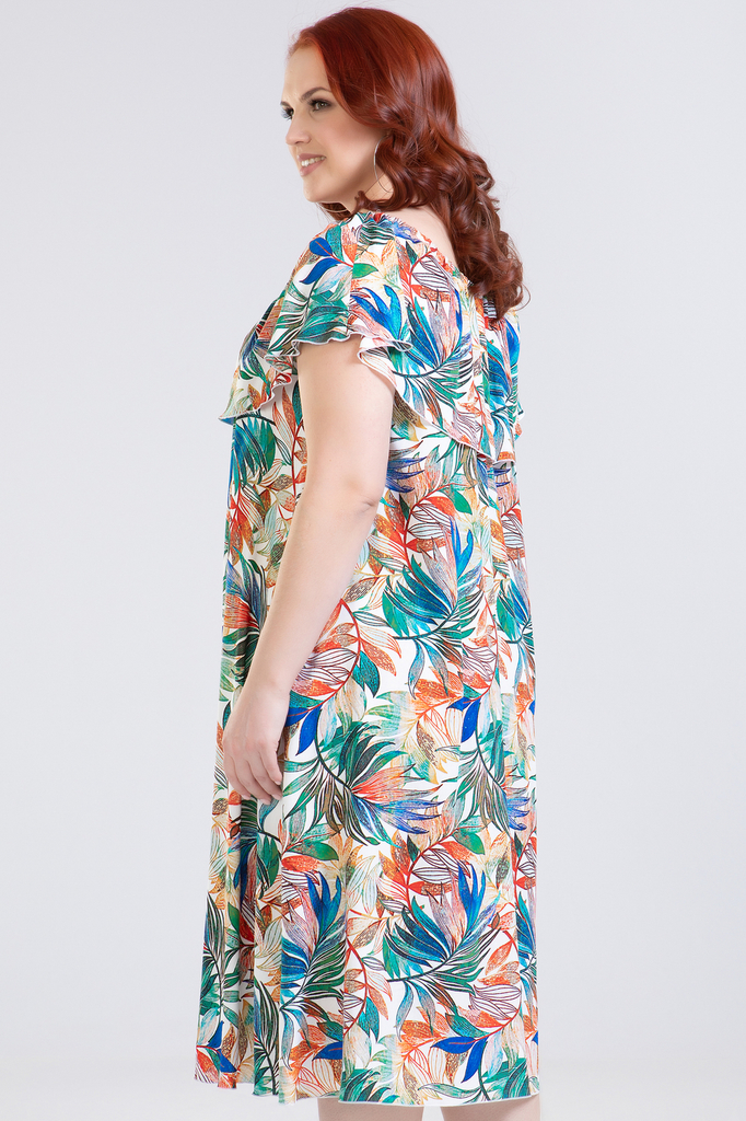 Платье трапециевидного силуэта, с кокеткой по переду и спинке. Горловина круглая, рукав втачной, короткий. Нижняя часть переда и спинки с застроченными складками, на подкладке. По низу подкладки - при... Показать описаниетачная оборка из основной ткани.Наименование ткани. Шифон. Силуэт. Трапециевидный. Длина изделия. 105. Тип рукава. Втачной. Длина рукава. Короткий. Состав (по процентам). 65% пэ, 30% вискоза, 5% эластан. Застежка. Нет. Уход. Машинная стирка 30°С. Производитель. Prima linea/Прима линия Рост модели. 180. Cезон. Весна-лето. Размерный ряд. 48-64. Цвет. Мультиколор. Вид материала. Плательная.