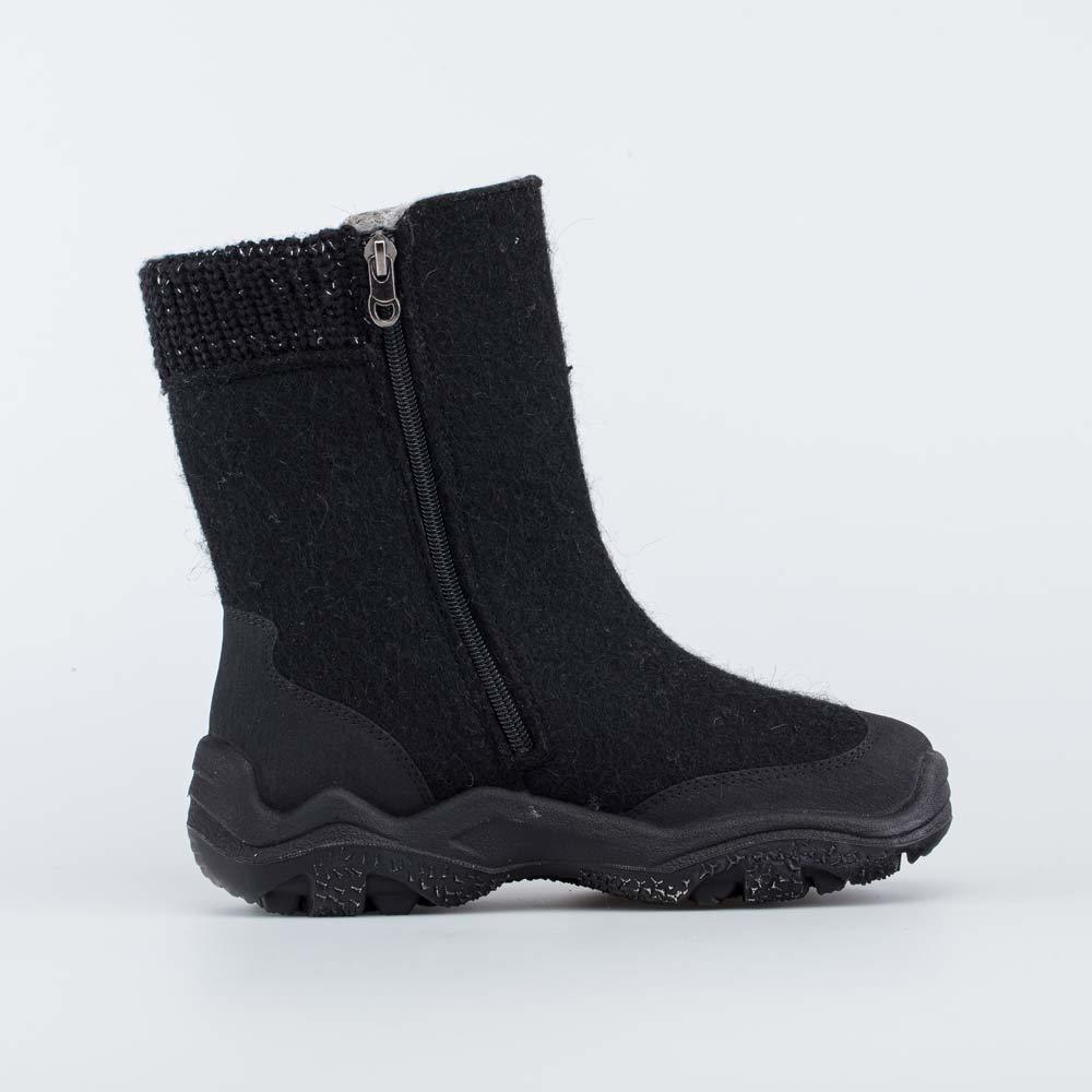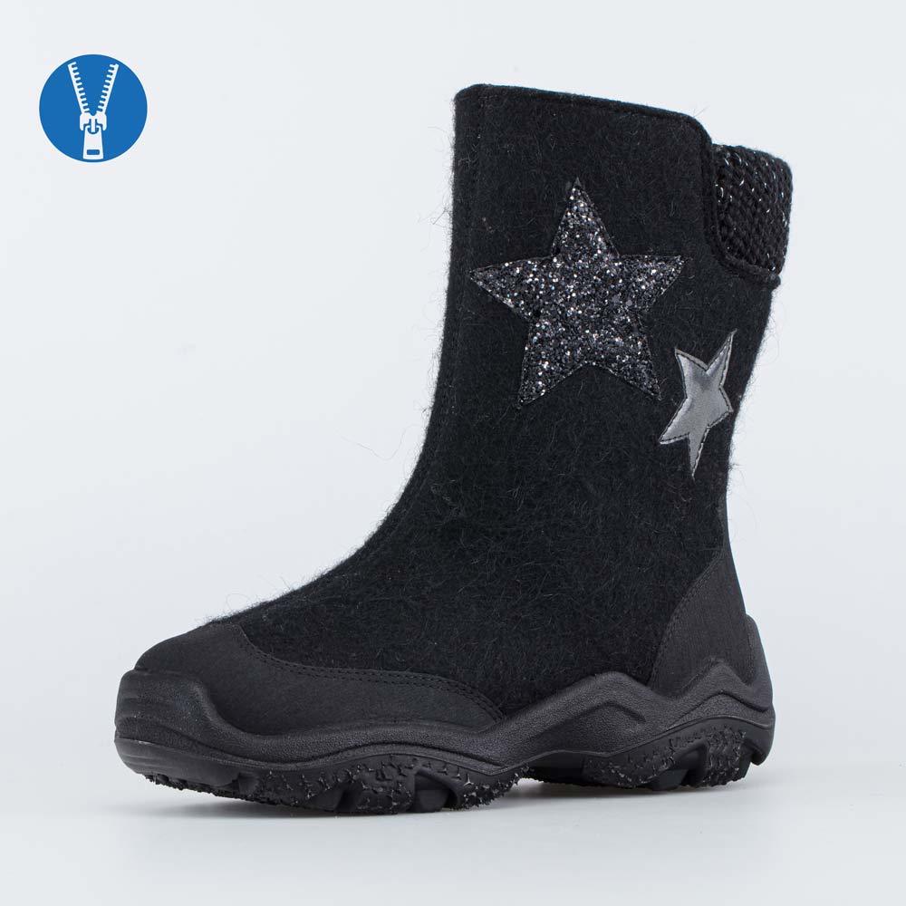 Черные валенки для мальчика, стилизованные под высокие ботинки, выполнены из натурального войлока. Войлок плотный, с водоотталкивающими свойствами, дышит и создаёт при этом приятный климат вокруг стоп... Показать описаниеы на улице и в помещении. Материал подкладки - шерстяной мех из натуральной овечьей шерсти. Он отлично сохраняет тепло, отводит влагу от ноги, придает дополнительный комфорт. Две липучки-велькро придают обуви максимальную раскрываемость и позволяют отрегулировать обувь на ноге. По всему периметру модель имеет дополнительную кожаную накладку со специальным полиуретановым покрытием, придающим дополнительную износостойкость и защиту от химических реагентов. Валенки оснащены световозвращающими элементами. Подошва выполнена из полиуретана – легкая и амортизирующая. Имеет накладку из резины для придания устойчивости на зимних дорожках. Сделано в России.