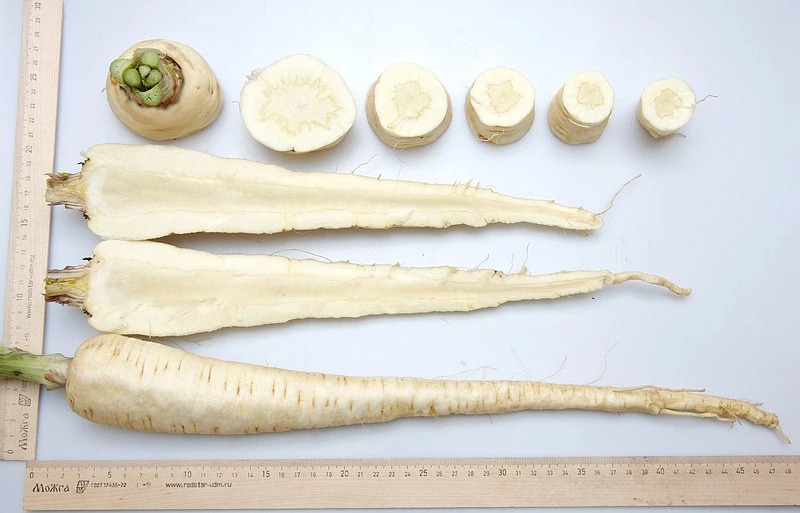 Позднеспелый сорт. От посева семян до технической спелости 180 дней. Листовая розетка полуприподнятая. Лист зеленый, блестящий. Корнеплод удлиненно-конической формы, длиной 20-25 см, шириной 6-8 см, б... Показать описаниеелый. Поверхность корнеплода гладкая, без боковых корней, мякоть белая. Вкусовые качества хорошие. Масса 200-300 г. Корнеплод погружен в почву полностью. Лежкость корнеплодов в период зимнего хранения хорошая. Рекомендуется для использования в свежем виде и хранения. Урожайность 4-5 кг/м2.