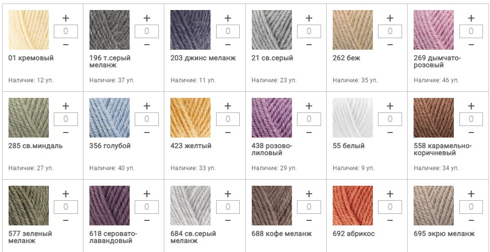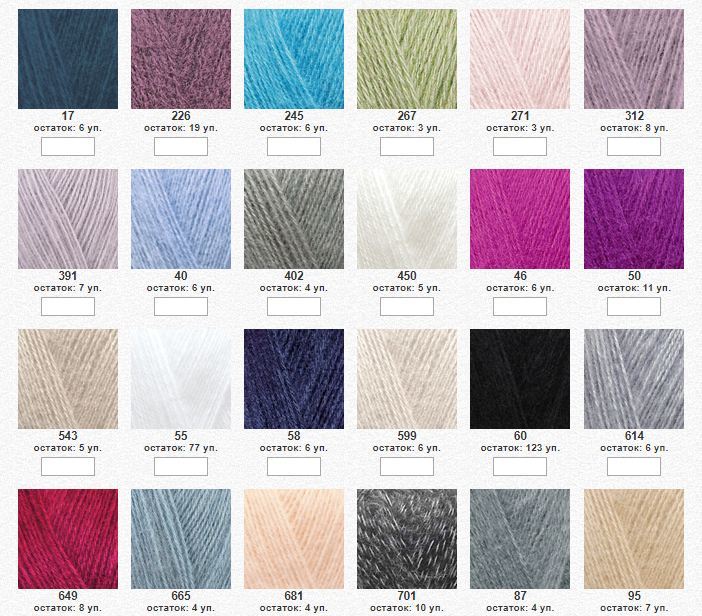Вес упаковки: 500 гр (5 мотков) Состав: 51% акрил, 25% мохер, 24% шерсть Метраж: 500 м Вес мотка: 100 гр Вес упаковки: 500 гр (5 мотков)Цвета смотреть здесь.
