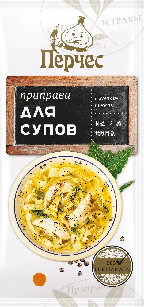 Специально подобранная смесь для приготовления вкусных домашних супов и бульонов. Рекомендуем добавлять приправу не менее чем за 15 минут до готовности