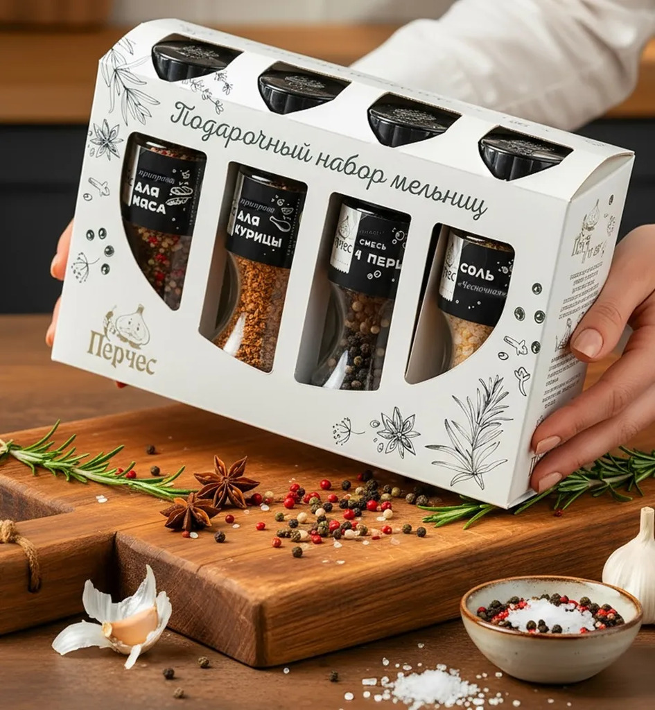 Хотите порадовать близких оригинальным и полезным подарком? Набор мельниц Перчес - то, что вам нужно! Элегантные мельнички с частоиспользуемыми приправами понадобятся всем, кто любит готовить. Что дел... Показать описаниеать? Просто заказать идеальный подарок в прекрасной упаковке! Состав набора: мельницы "Итальянские травы", "Для мяса", смесь перцев с кориандром, смесь перцев "Пикантная"